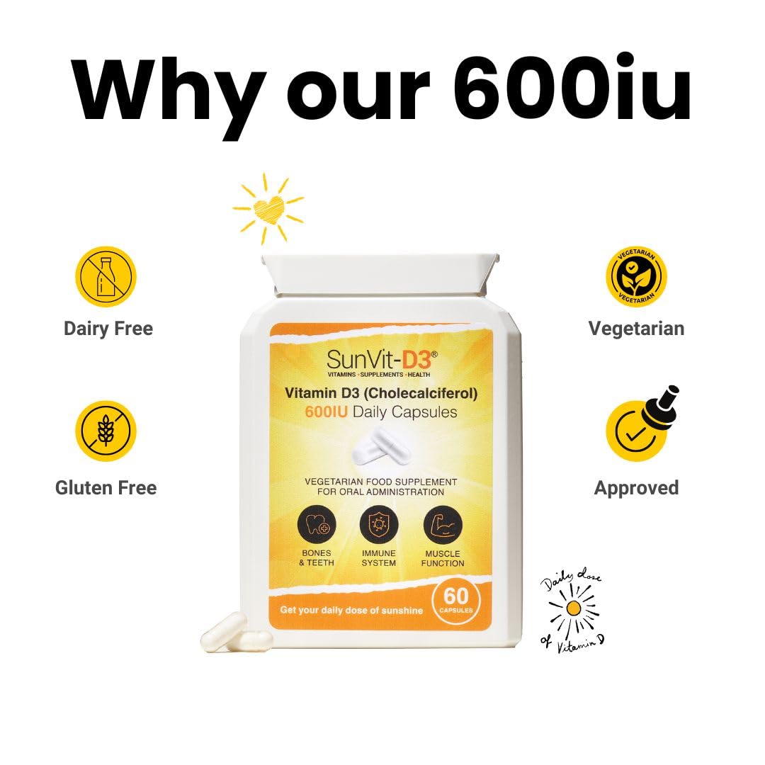 SunVit-D3 Vitamin D 600 IU Capsules - Cholecalciferol Vitamin D Capsules Support the Maintenance of Bone, Teeth, Muscle & Immune System | Made in UK & GMP Approved - D3 Vitamins 60 Convenient Capsules