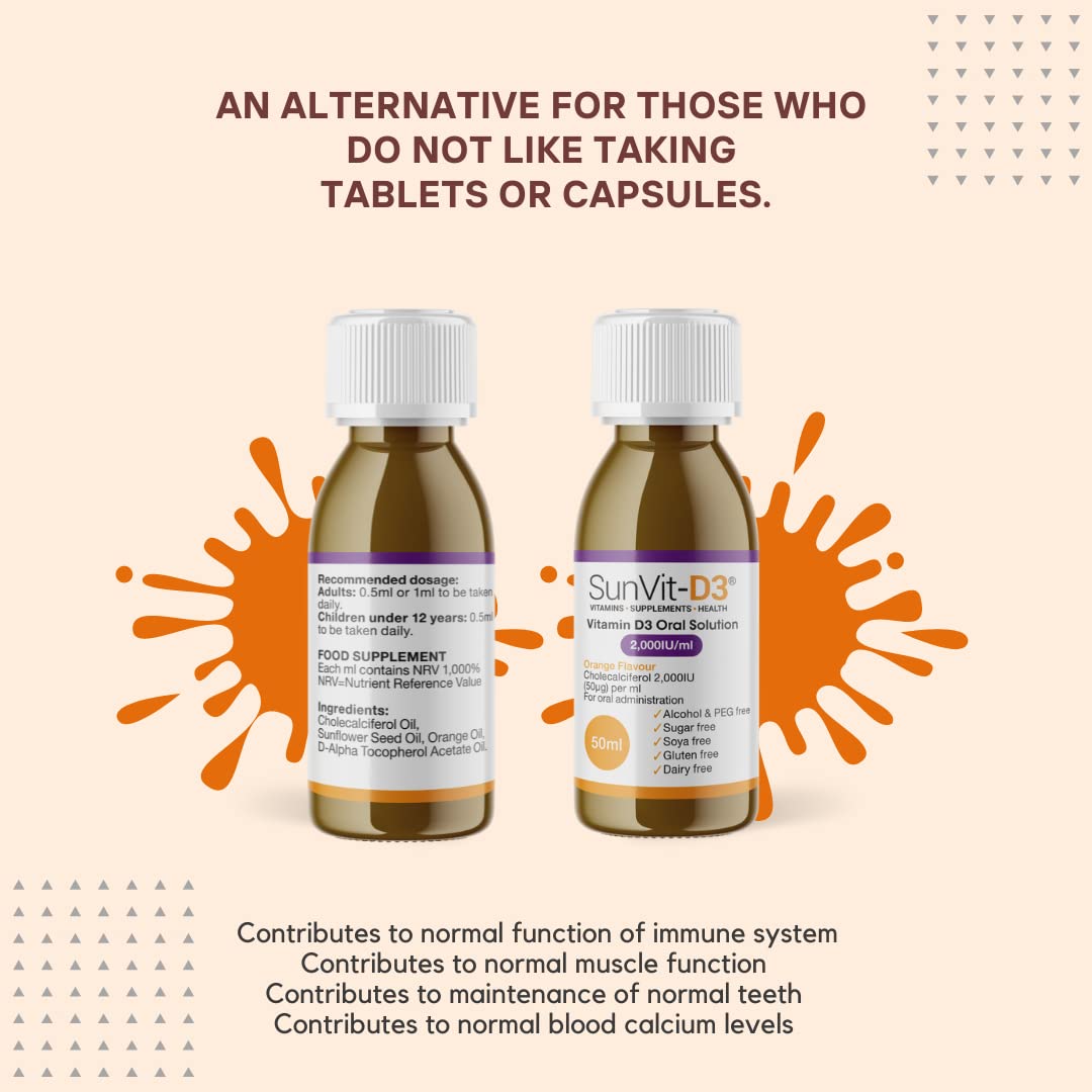 - Your easiest Vitamin D3 partner: SunVit-D3 Vitamin D3 2000IU Oral Solution offers a convenient and effective way to boost your vitamin D levels. Formulated as an orange-flavored liquid, this solution provides a palatable alternative to tablets and capsules, making it suitable for all ages.