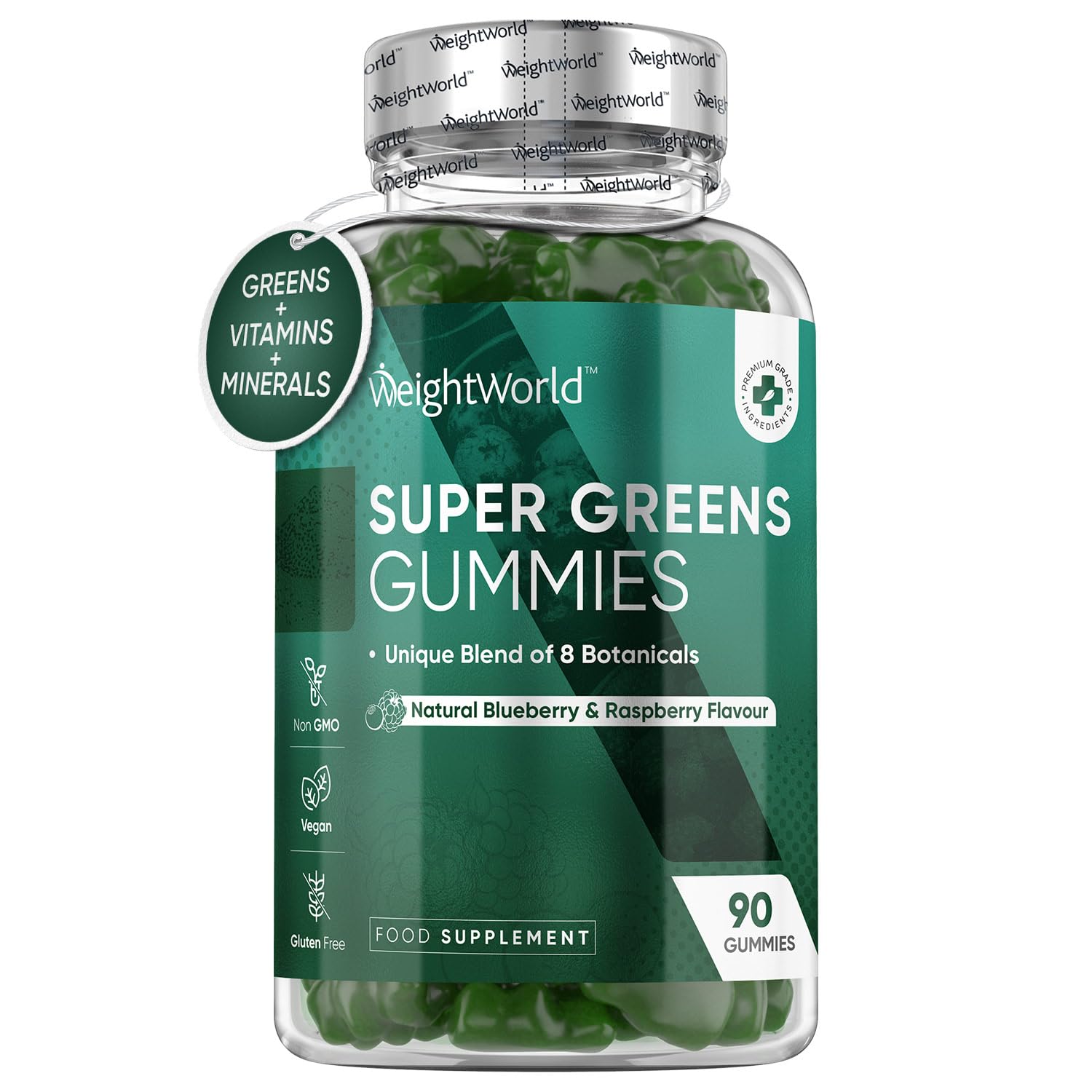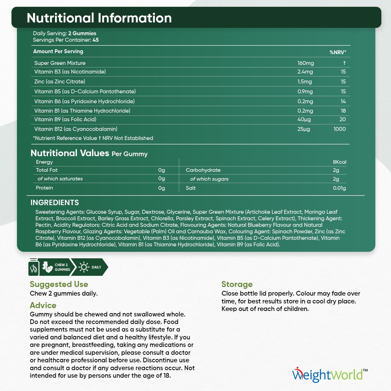 Super Greens Gummies - 90 Vegan Gummies - Blend of Botanicals with Essential Vitamins & Minerals - Natural Blueberry & Raspberry Flavour - for Energy & Immunity - Alternative to Super Greens Powder