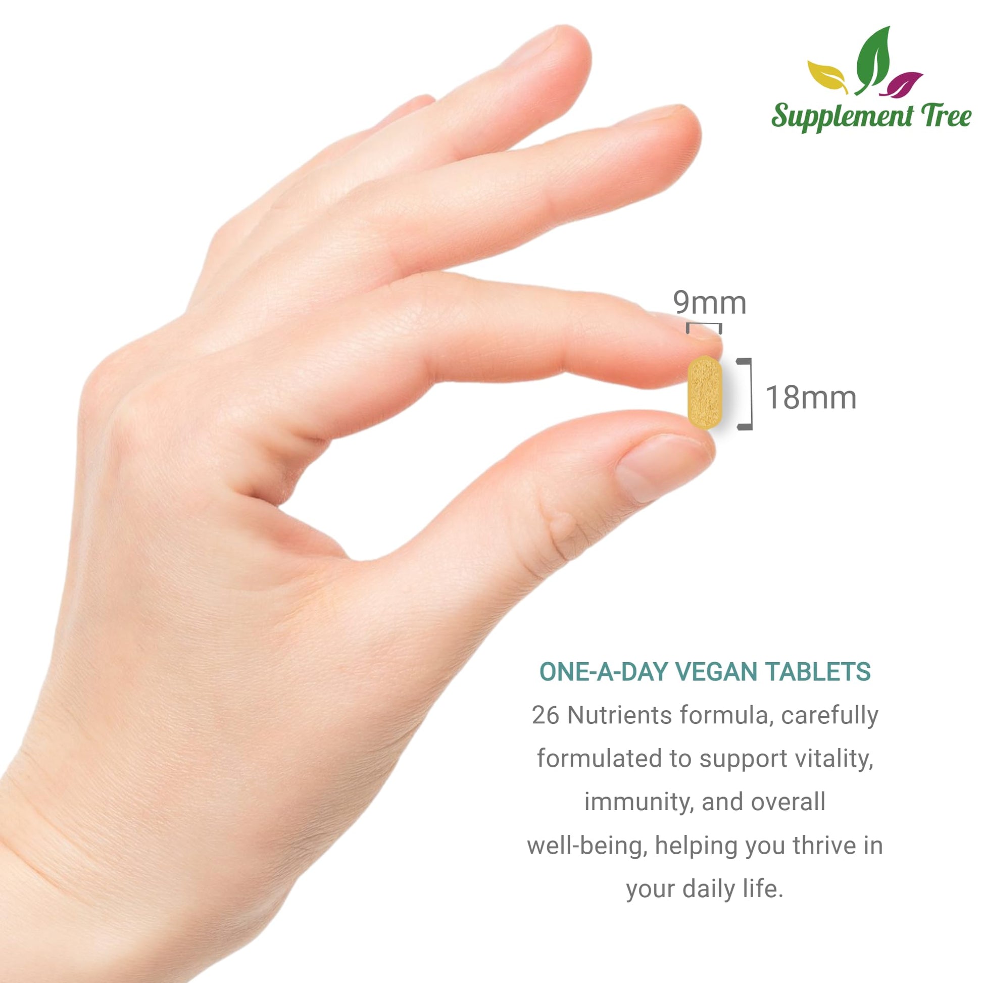 PREMIUM MULTIVITAMIN AND MINERAL FORMULA – Supplement Tree’s A-Z Multi Vitamins & Minerals is a comprehensive supplement packed with 26 essential nutrients, conveniently delivered in a single daily tablet. Our Vegan A-Z Multivitamin and Minerals Tablets are specially formulated to provide a comprehensive array of essential vitamins and minerals, carefully formulated to support vitality, immunity, and overall well-being, helping you thrive in your daily life.26 ESSENTIAL NUTRIENTS – Our potent formula combines carefully chosen vitamins and minerals, including Vitamin A, Vitamin C, Vitamin D, Vitamin E, Vitamin K, Thiamine, Riboflavin, Niacin, Pantothenic Acid, Vitamin B6, Vitamin B12, Folic acid, Biotin, Calcium, Potassium, Phosphorous, Chromium, Chloride, Copper, Iodine, Iron, Magnesium, Manganese, Molybdenum, Selenium, and Zinc. Experience the benefits of our high-strength complex designed to support your overall well-being.