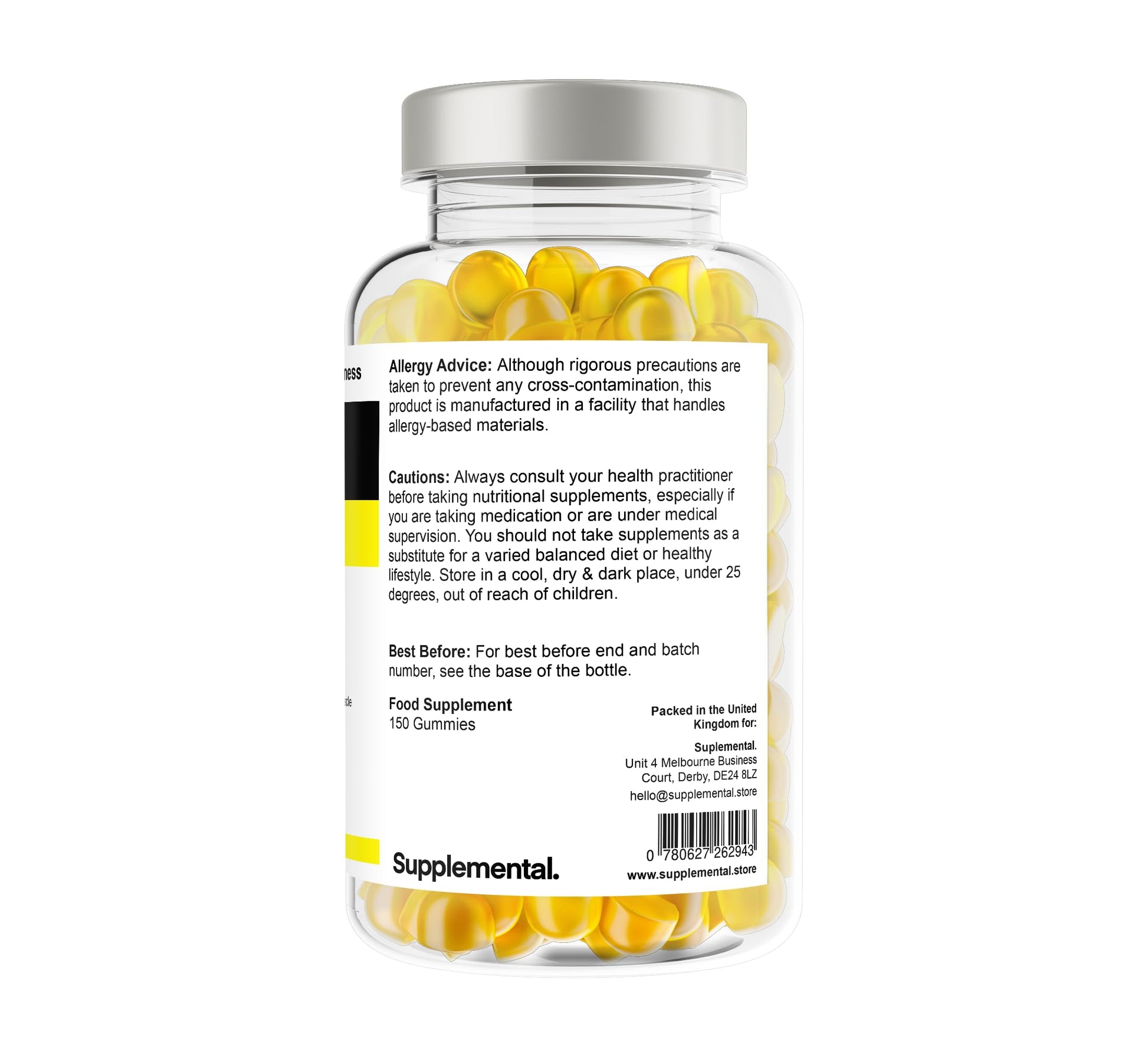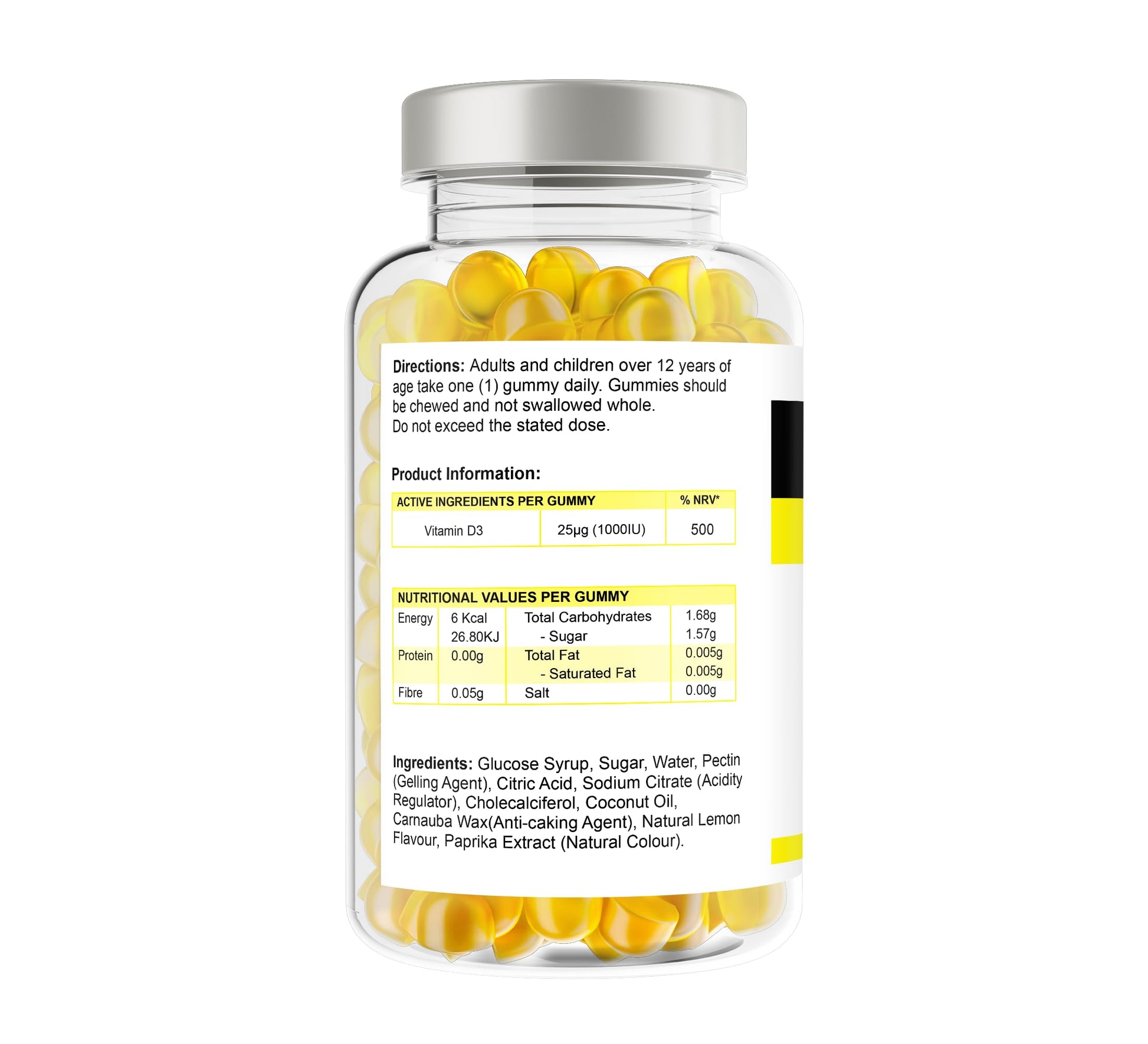 Experience the delicious taste of our plant-based Vitamin D3 Gummies, available in a convenient 150-count bottle. Each lemon flavoured gummy contains 1000IU or 25µg of Vitamin D3, providing 500% of the NRV. Suitable for adults and children over 12 years old, these gummies support bone, muscle, and immune system health, contribute to normal blood calcium levels, and maintain normal teeth and bones. They are also free from gluten, milk, soybeans, yeast, artificial colors, flavors, sweeteners, and preservatives. Manufactured in a facility that handles allergy-based materials, these gummies are a great option for vegetarians looking to support their normal cell division and growth and development of bones in children. Chew one gummy daily for optimal results.More Info