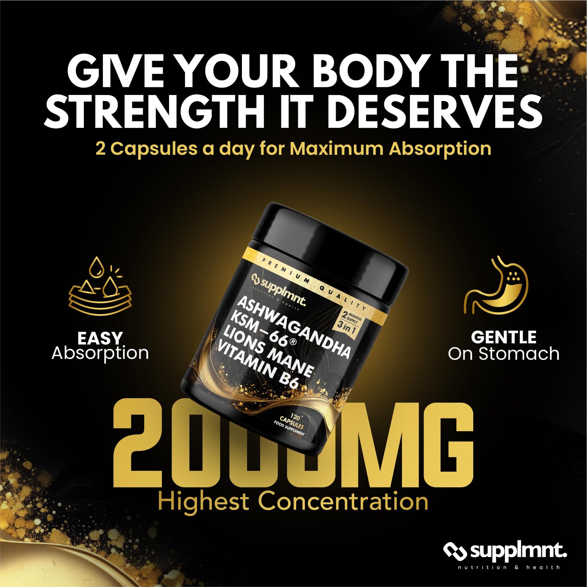 supplmnt. Ashwagandha KSM-66, Lions Mane & Vitamin B6 Capsules - High Strength 2000mg KSM-66 Ashwaghandha Root Extract & Lions Mane Mushroom with Vitamin B6 2-120 Vegan Capsules with Black Pepper - 2 Months