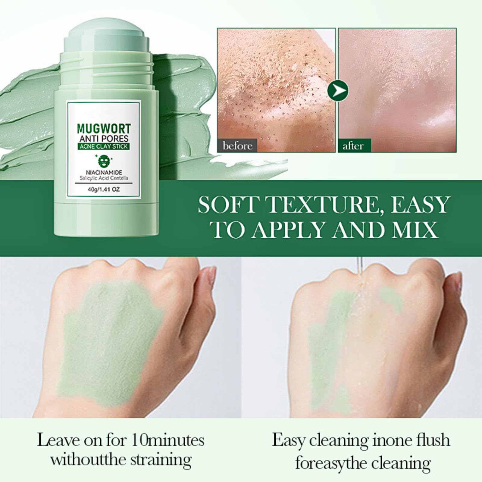 ● GENTLE & NATURAL - With natural mugwort ingredients of this green clay mask stick, no irritation, no harm, mild to the skin