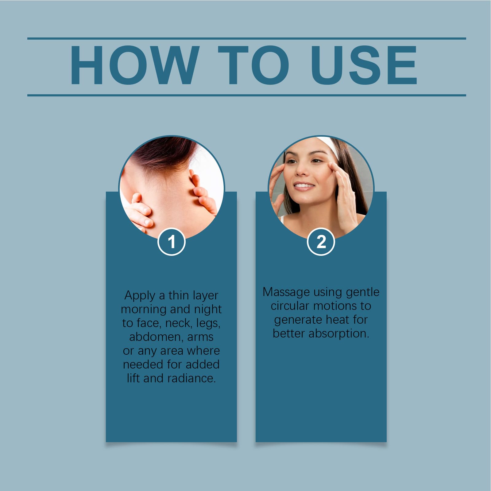 Step 2: Apply a thin layer morning and night to face, neck, legs, abdomen, arms or any area where needed for added lift and radiance.