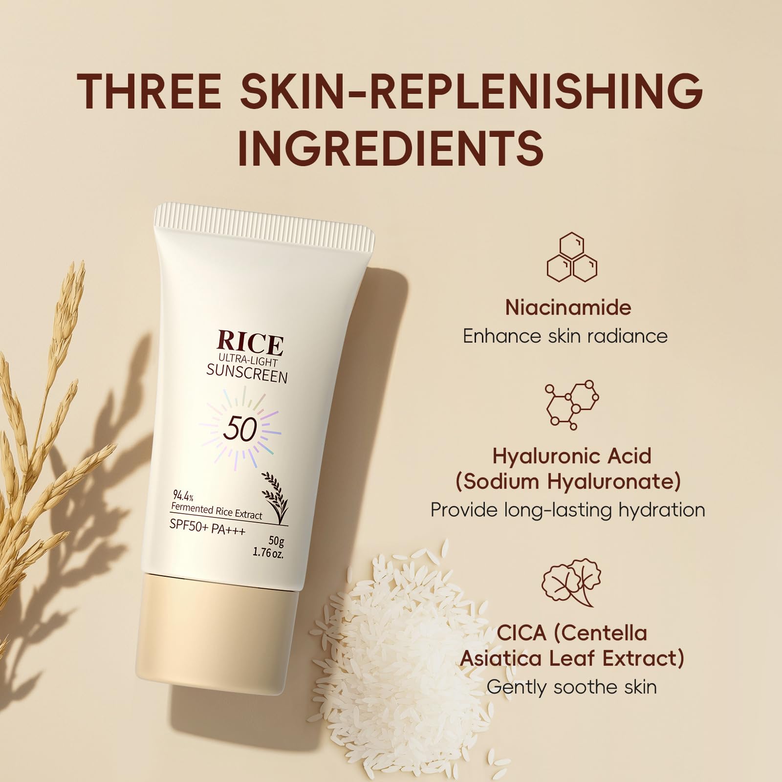 ThamGlow Rice Ultra-Light Sunscreen SPF 50+ PA +++, Rice Face Cream With SPF, Face Sun Cream Lightweight Non Greasy Sunscreen, Invisible UVA/UVB Protection, Hydrating Formula, No White Cast
