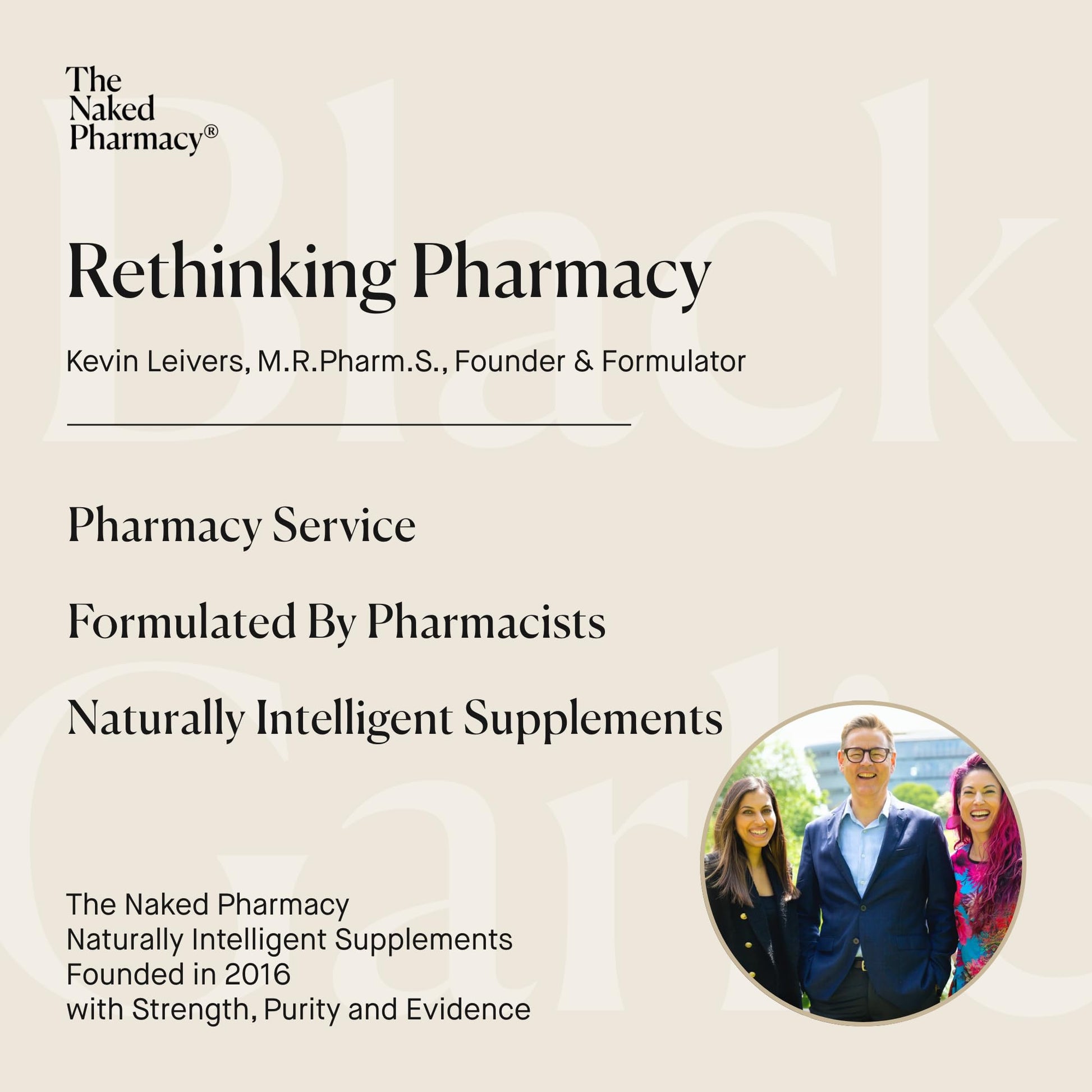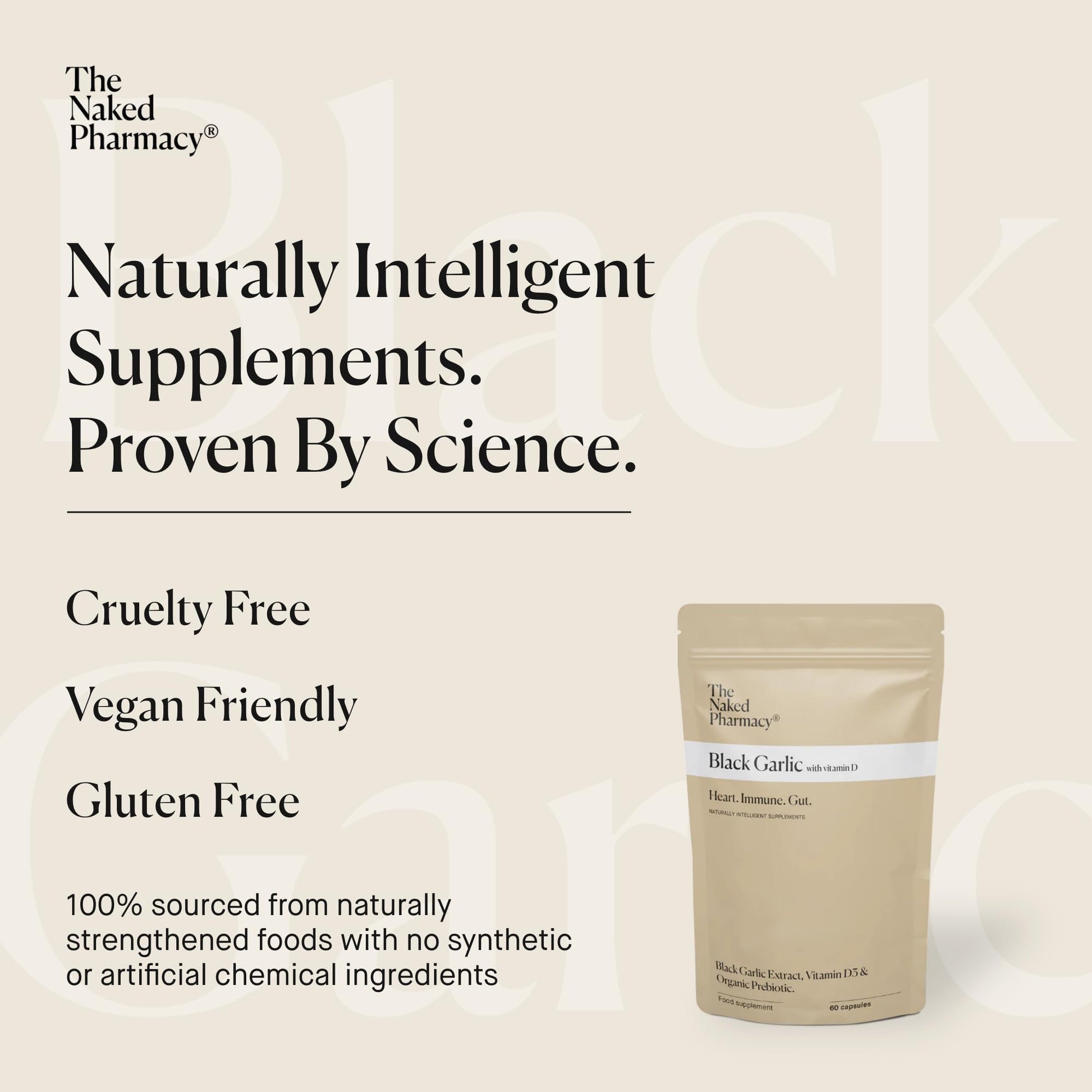 The Naked Pharmacy's odourless Black Garlic supplement contains high strength, premium grade fermented black garlic extract, combined with Vitamin D3 and organic prebiotic Moringa leaf extract as a plant-based source of vitamins and minerals.More Info
