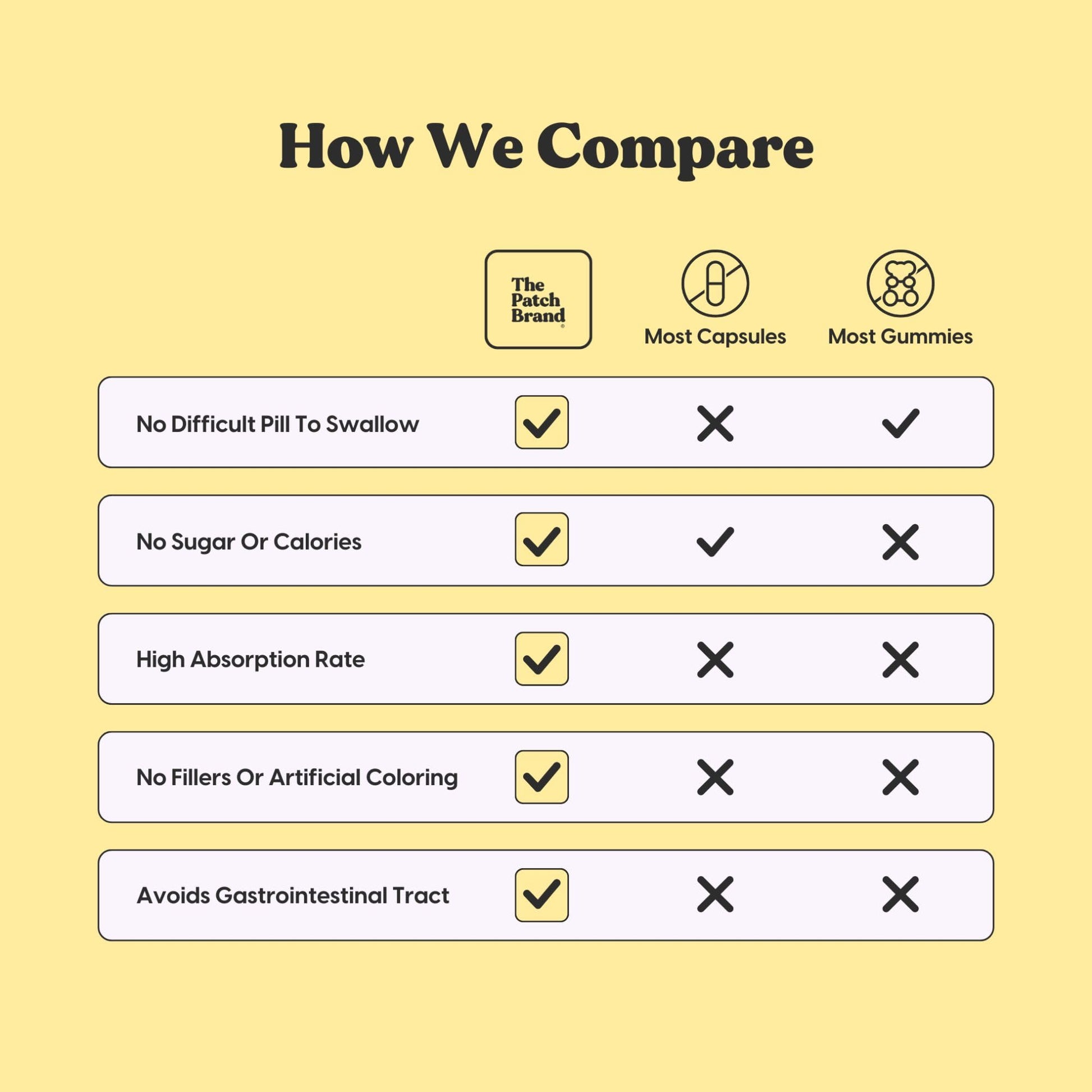 - SUPERIOR ABSORPTION: Vitamin capsules, tablets, and pills have poor absorption properties, allowing only 10% of the effects of the active ingredients. Our innovative patch allows for much higher absorption rates and a steady release of the active ingredients - giving you up to 24 hours of continuous benefit.