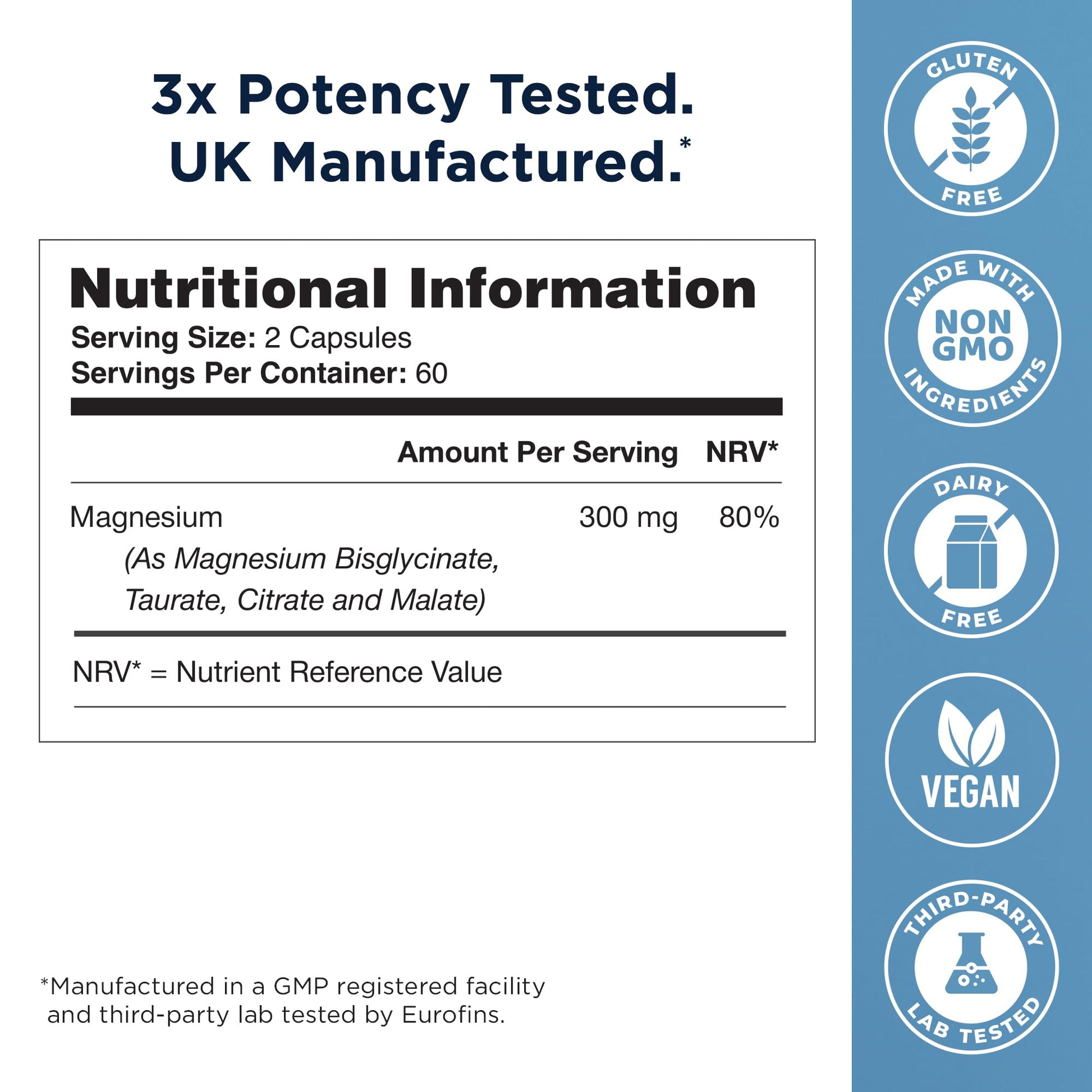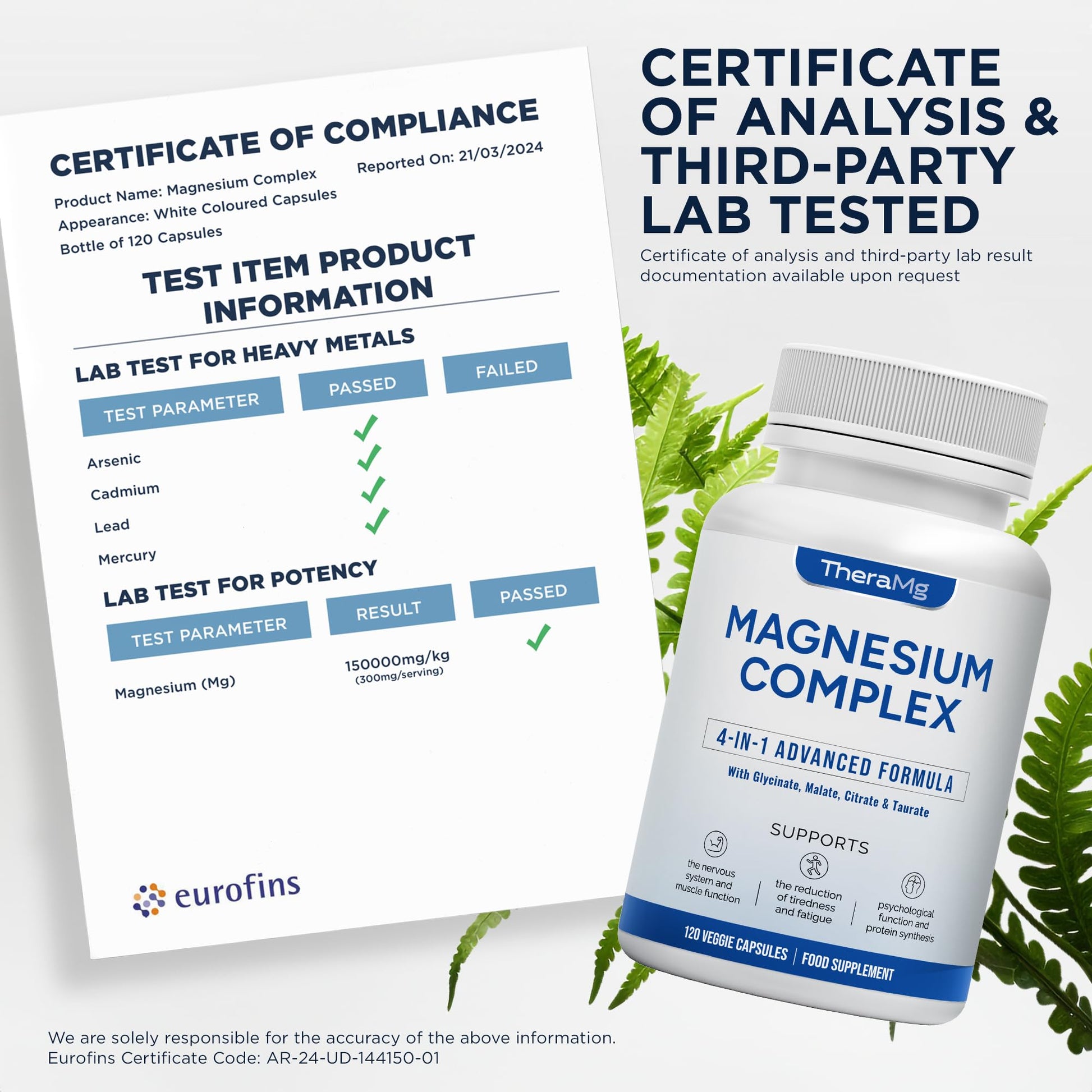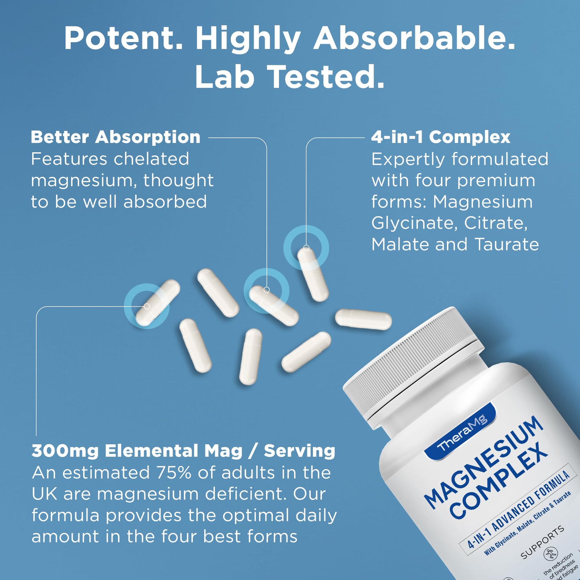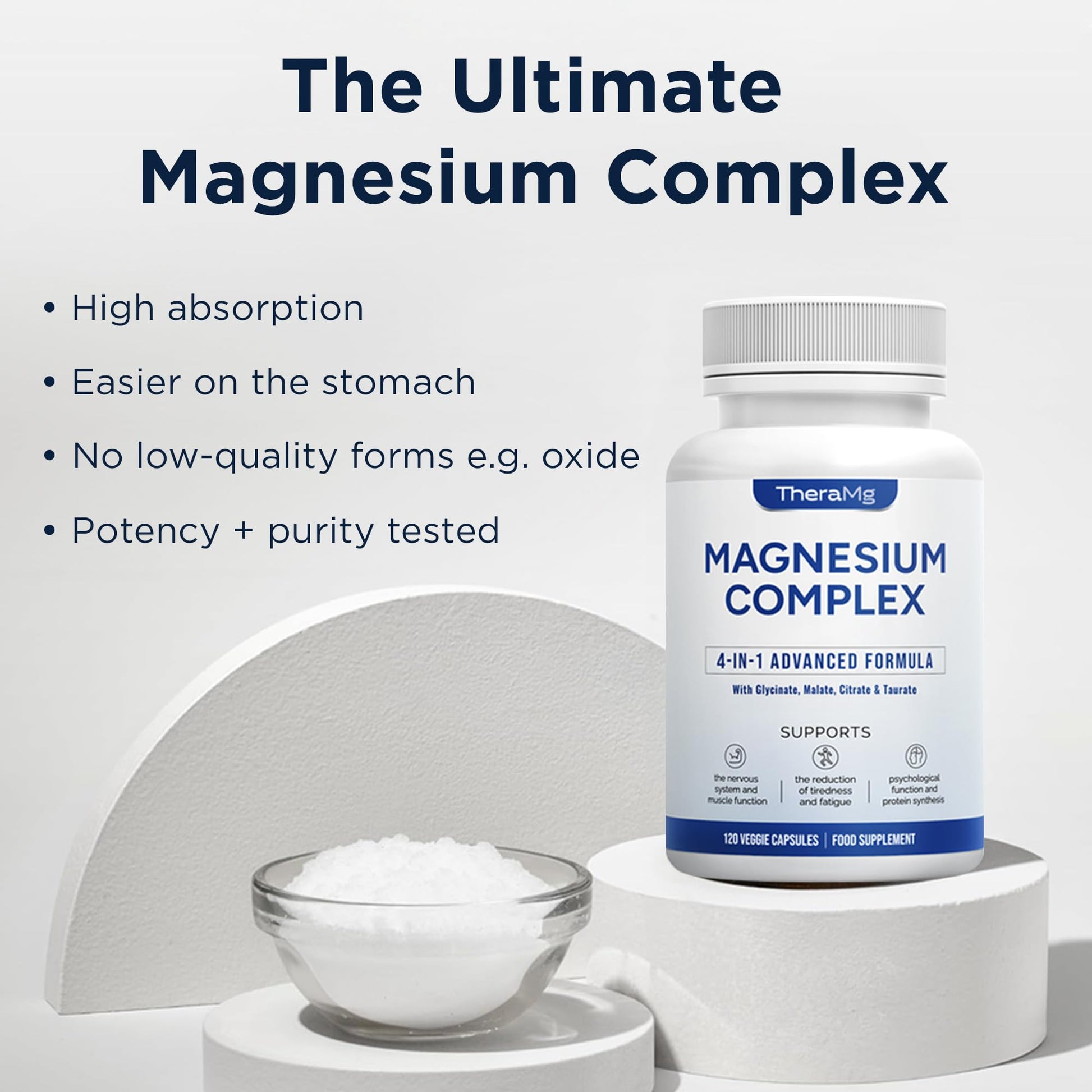 TheraMg Magnesium Glycinate 4-in-1 Complex - Citrate, Malate & Taurate for Sleep, Tiredness, Muscles & Nervous System - 300mg Elemental Magnesium - High Strength, Chelated, Vegan - 120 Capsules - Made in UK