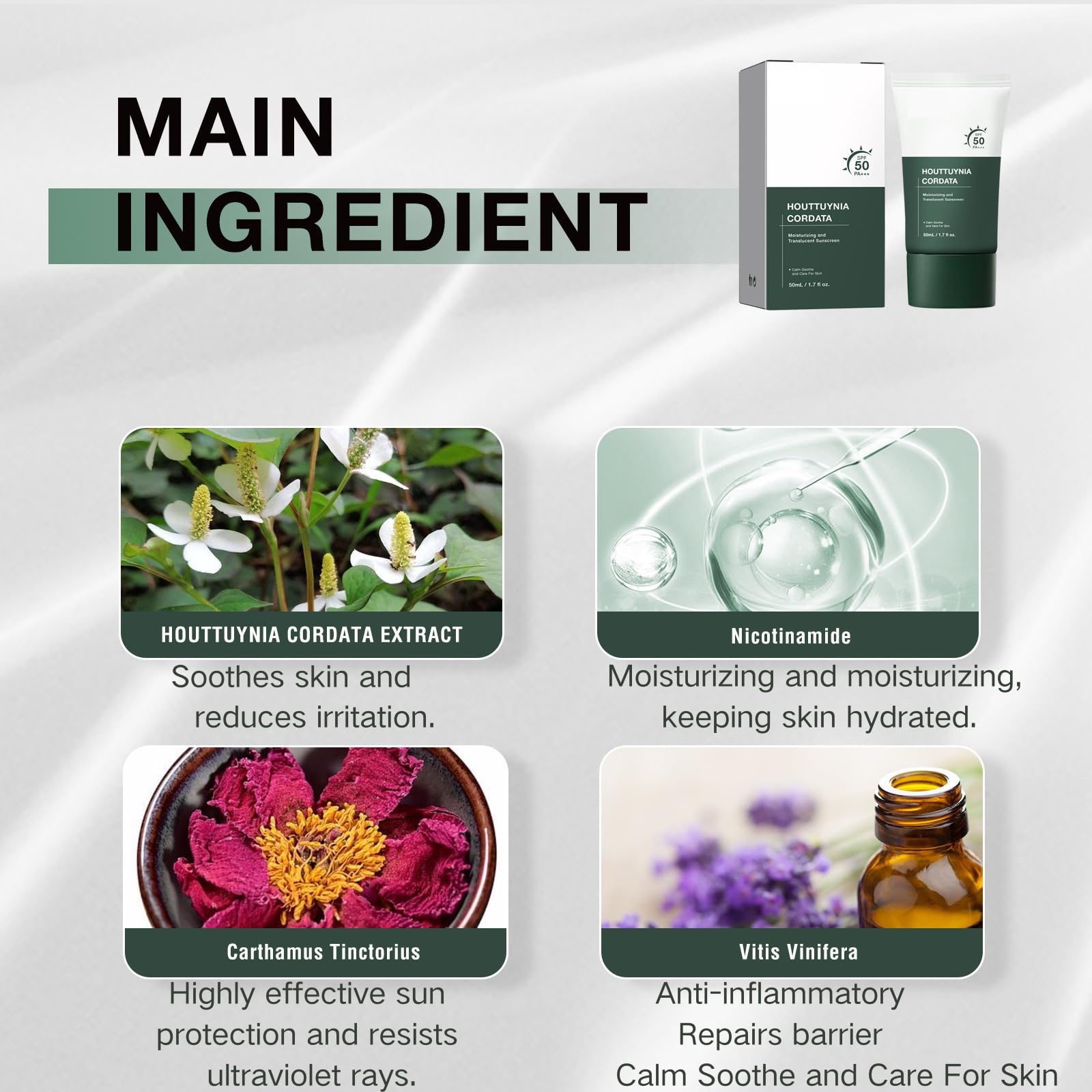 Tianyue Heartleaf Silky Sunscreen Spf 50+++,Korean face moisturizer&Translucent Sunscreen,Lightweight Face Sun Cream,Spf 50 face Moisturiser -Broad Spectrum UV Protection,Non-Greasy, No White Cast 50mL.