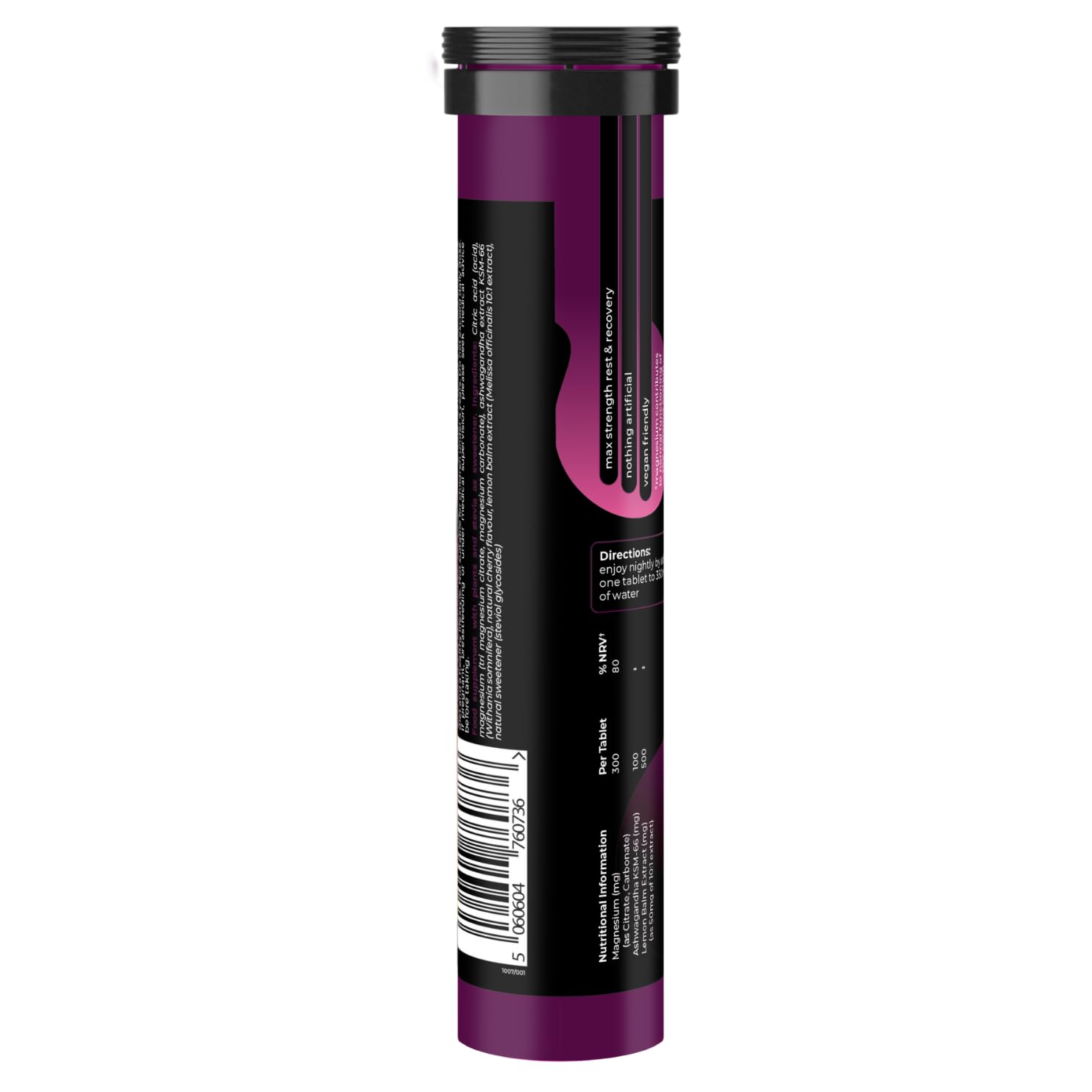 Achieve ultimate relaxation and restful sleep with our 4-in-1 Formula Magnesium Supplements. Each serving combines the benefits of 300mg of magnesium, 100mg of KSM-66 Ashwagandha, and 500mg of Lemon Balm—a unique blend of hydration, adaptogens, minerals, and plants expertly designed to support your body's relaxation and recovery. Unlike other supplements, these cherry-flavored magnesium tablets are sugar-free and free from artificial sweeteners, making them a clean and effective addition to your wellness routine. Whether you're seeking to unwind after a busy day or enhance your sleep quality, our tablets provide the support you need. Incorporate this magnesium drink as part of your daily health regimen: energize with Energy & Hydration in the morning, fortify your immunity at noon with Daily Immunity, and wind down at night with Rest & Recover for a refreshing sleep. Developed with the guidance of doctors and nutritionists, our formula uses premium ingredients like KSM-66 Ashwagandha to manage stress, Lemon Balm for calmness, and magnesium to ease muscle tension and improve sleep. Enjoy the delicious, calming cherry flavor before bed and wake up rejuvenated, ready to tackle your day. Experience the difference with our safe, effective magnesium tablets crafted for optimal relaxation, recovery, and overall well-being.More Info