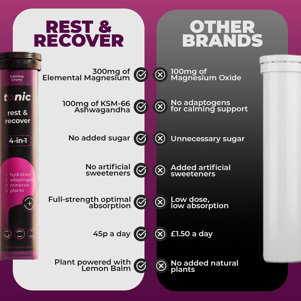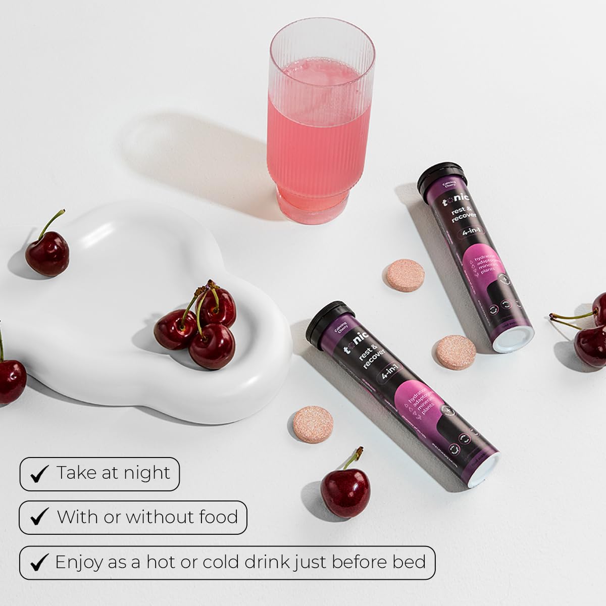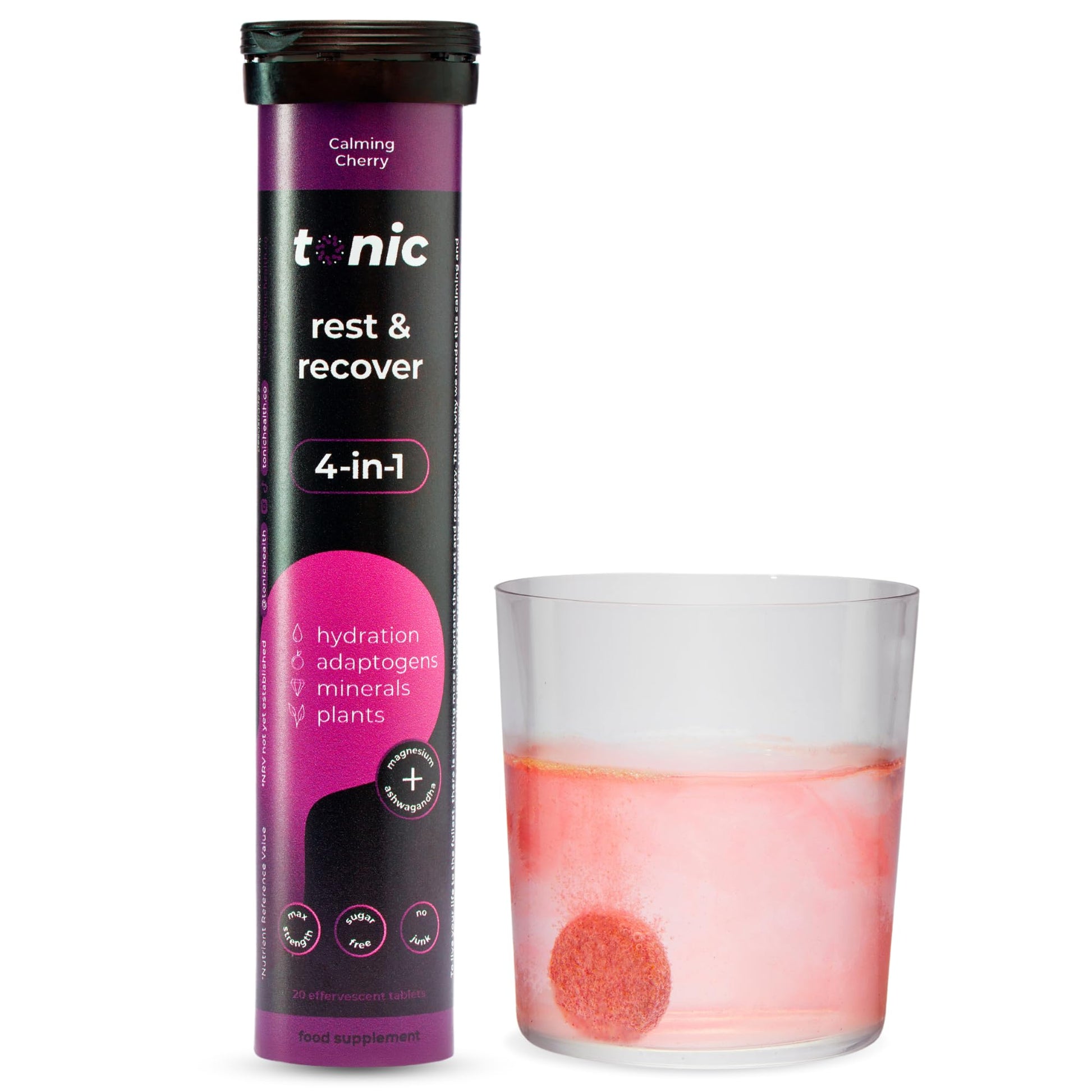 Tonic Health Rest and Recovery Magnesium Effervescent Tablets - 300mg Elemental Magnesium, Ashwagandha, Lemon Balm - No Sugar, Vegan Multivitamin - Relax and Recharge, Calming Cherry 20 Count
