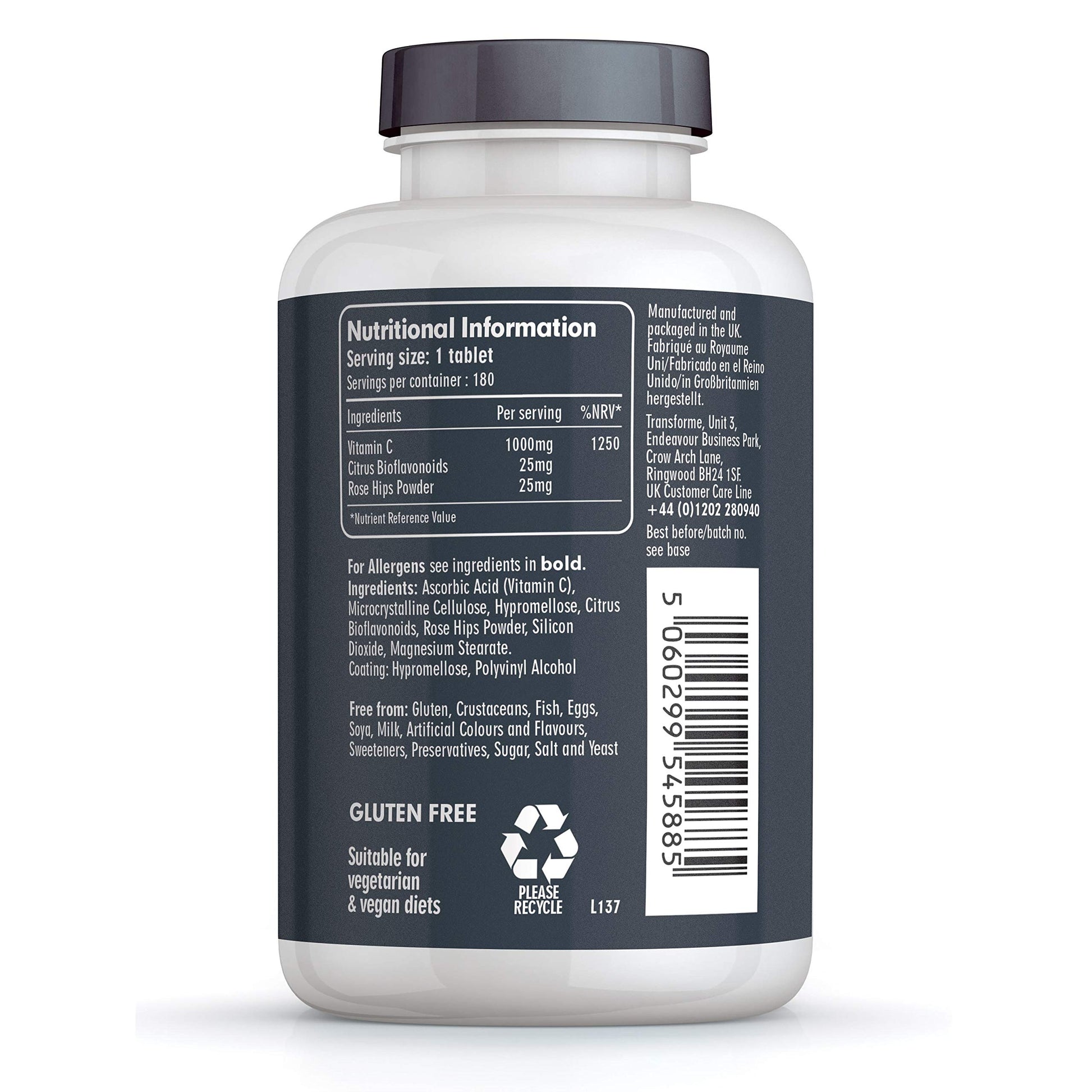 Transforme Vitamin C Time Release 1000mg | 180 Vegetarian & Vegan Tablets | with Rose HIPS and Bioflavonoids | High Strength | 6 Month Supply