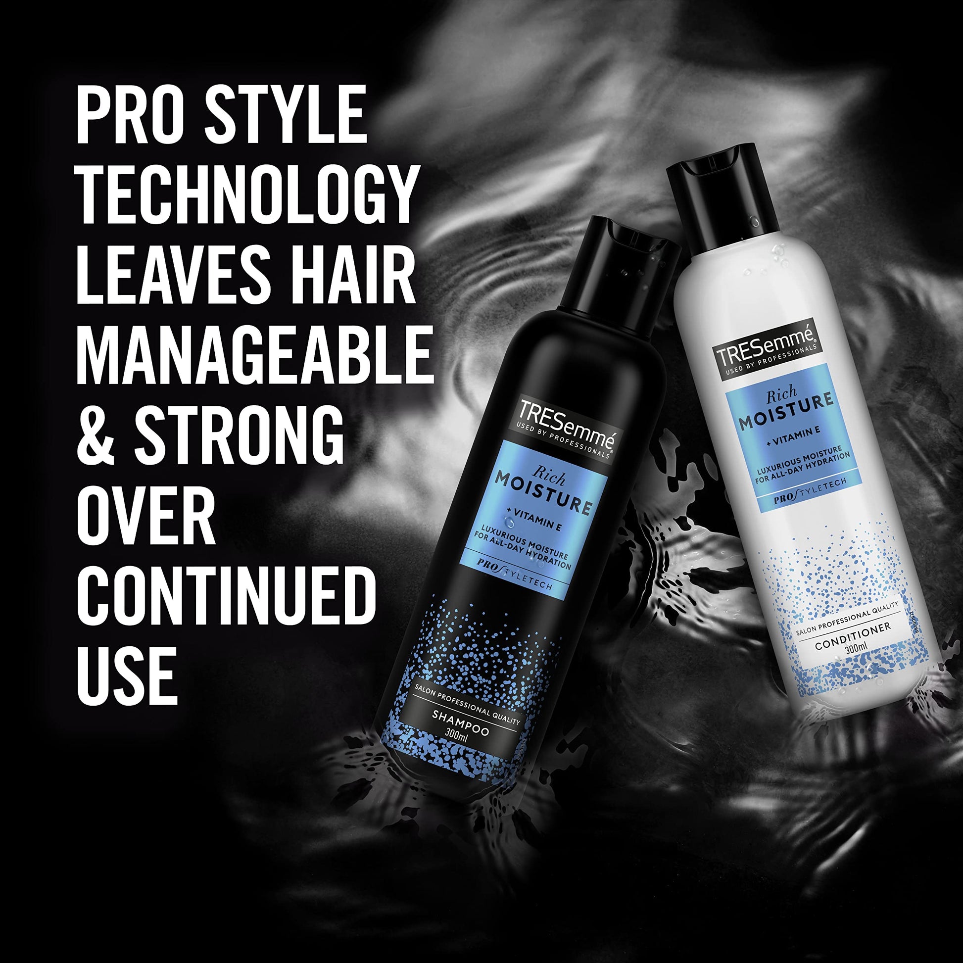 - Infused with vitamin E, Tresemme Rich Moisture Shampoo and Conditioner system keeps hair luxuriously soft and hydrated all day long
