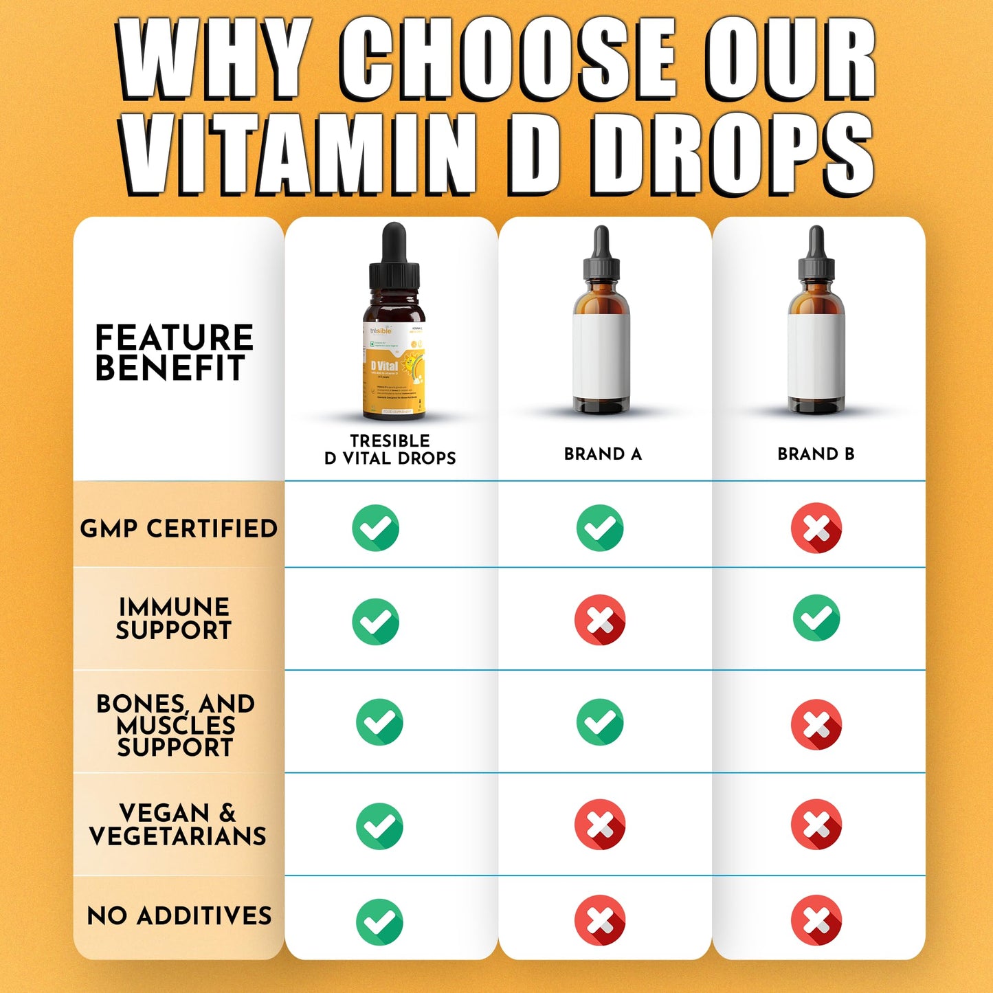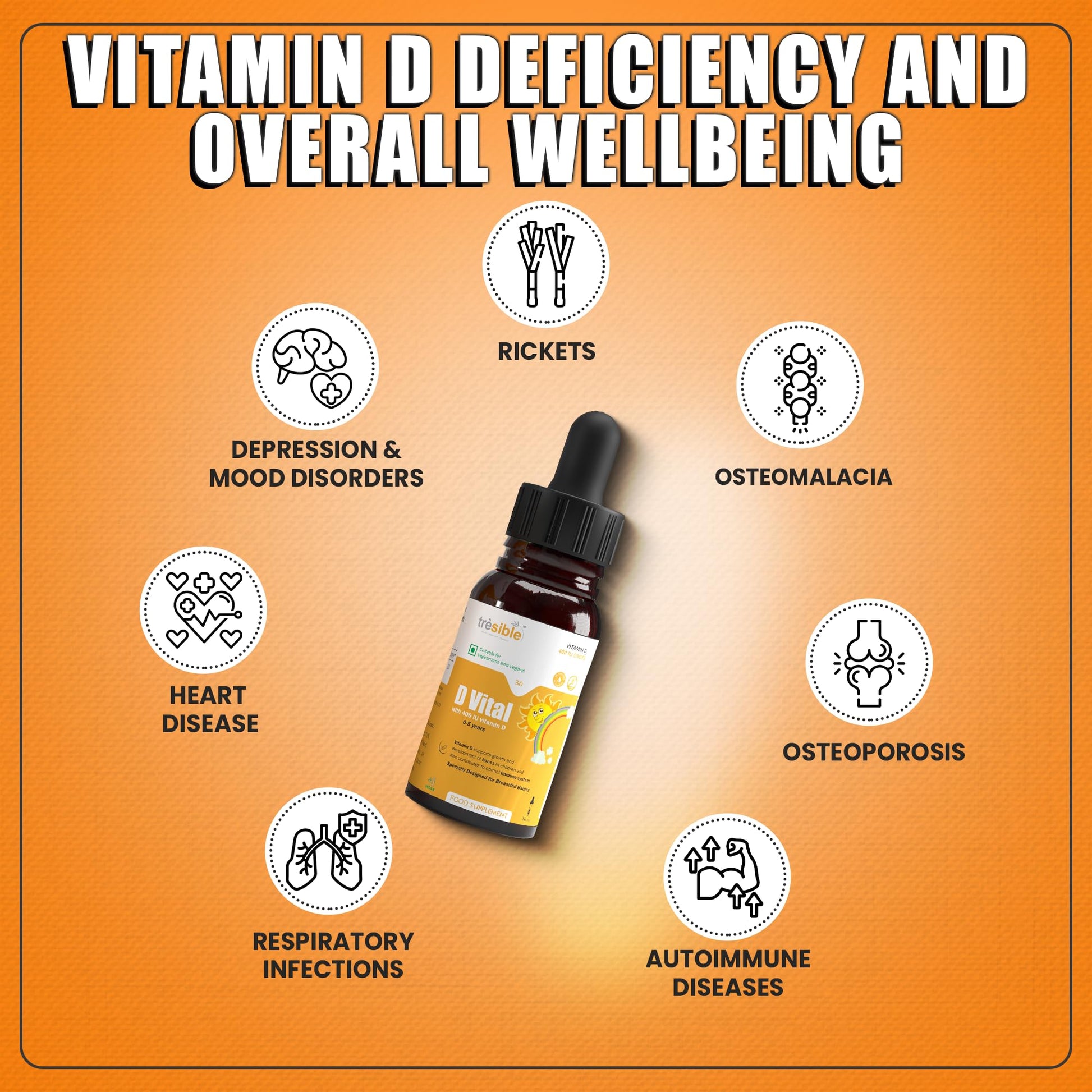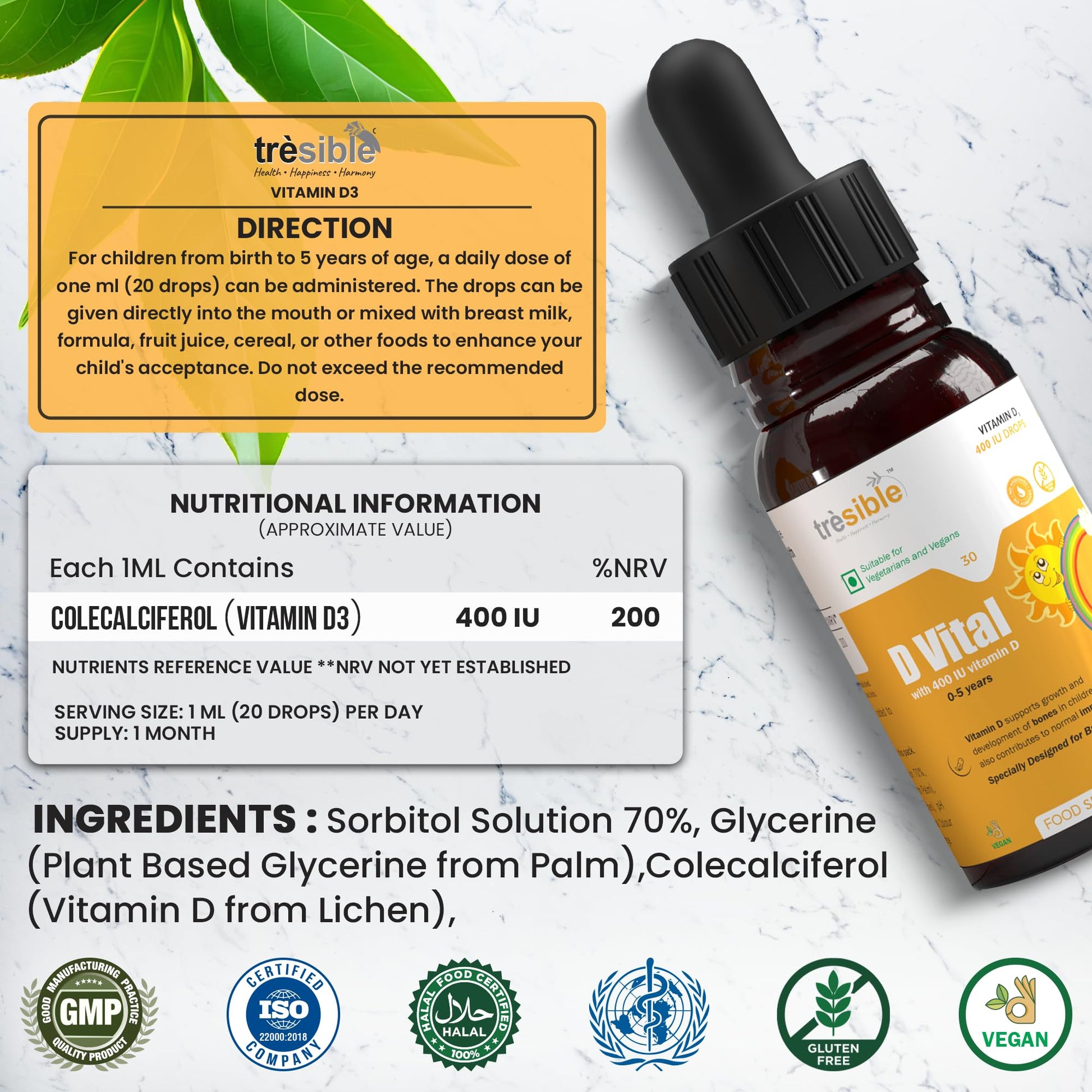 Introducing Tresible baby vitamin d mini drops, a vital supplement designed specifically for infants and young children up to five years of age. Each bottle provides a 1 month supply of vitamin d vegan in a delicious orange flavour, making it an enjoyable addition to your child’s daily routine. These baby vitamin drops are essential for developing strong bones, muscles, and teeth, ensuring that your little one receives the nutrients they need for healthy growth. The convenient vitamin d liquid form allows parents to easily administer the drops directly or mix them with breast milk, formula, or other foods, making it simple to enhance their child's diet. In addition to promoting bone and muscle health, vitamin d for babies significantly improves the immune system. This is crucial for protecting your child from common illnesses, helping to support their overall health and development. Furthermore, these vitamin d3 drops play a key role in supporting heart and respiratory functions, ensuring that your child not only grows strong but also maintains optimal health in crucial early years. By maintaining adequate Vitamin D levels, parents can foster a healthy cardiovascular system and effective respiratory health in their children. Quality is paramount for parents, and Tresible liquid vitamin d drops are both GMP and ISO certified, guaranteeing safety and efficacy. Vitamin d children drops are free from additives and suitable for various dietary preferences, including Halal, vegan, and vegetarian. Recommended by the Chief Medical Officer of the UK Government, these vitamin d baby drops newborn offer an authoritative guideline for dosage, allowing parents to feel confident in their choice. With a commitment to preventive healthcare, Tresible aims to help children reach their developmental milestones while ensuring peace of mind for caregivers.More Info