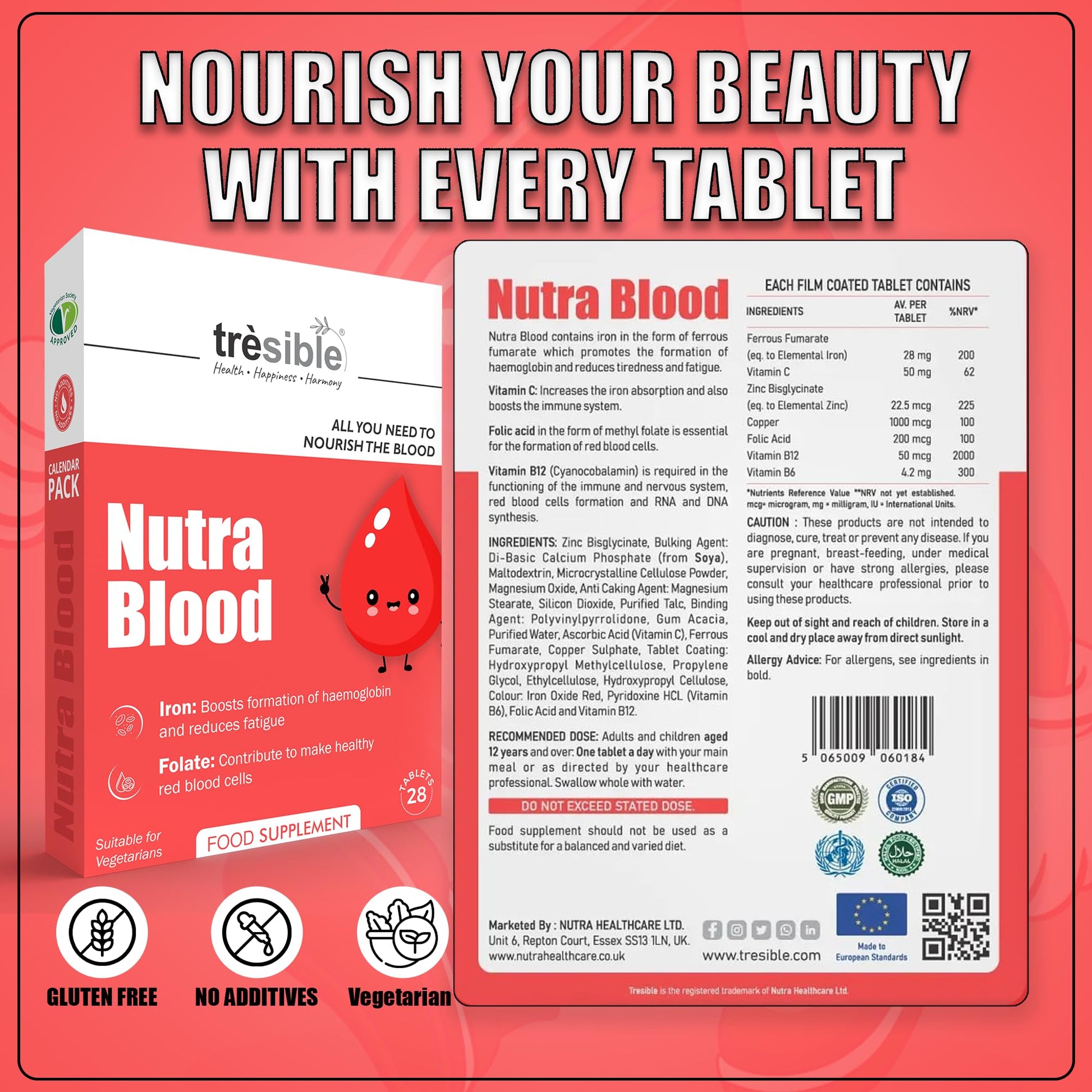 Natural Vitality for Your Blood Health with Iron Tablets for Anemia Are you constantly tired, low on energy, or struggling with poor blood health? Nutra Blood is your all-in-one solution designed to naturally support energy and vitality. Formulated with premium ingredients, Nutra Blood enhances blood circulation, boosts iron levels, and reduces fatigue, helping you feel revitalised every day. Why Choose Nutra Blood? Iron-Rich Formula: Each tablet is packed with essential iron to combat deficiency, promote the production of healthy red blood cells, and improve oxygen flow throughout the body. Energy-Boosting B Vitamins: Enriched with B12 and B6, Nutra Blood supports your body’s natural energy production, helping fight tiredness and improve focus. Supports Immunity & Overall Health: With added folic acid and key nutrients, Nutra Blood not only improves blood health but also strengthens immunity and supports overall well-being. Vegetarian-Friendly: Our 100% plant-based formula provides effective blood health support without compromising dietary preferences, making it perfect for vegans and vegetarians. Easy-to-Swallow Tablets: Conveniently-sized tablets fit easily into your daily routine, whether you're at home or on the go. Who Is Nutra Blood For? Individuals with low iron levels or anaemia Those experiencing constant fatigue or weakness People looking to boost their energy and vitality Anyone aiming to support healthy red blood cell production and improve blood circulation Vegetarians seeking strong iron tablets that align with their dietary needs Reclaim Your Energy with Nutra Blood! Don’t let fatigue or poor blood health hold you back. Try Nutra Blood’s gentle iron tablets today and restore your energy naturally.More Info