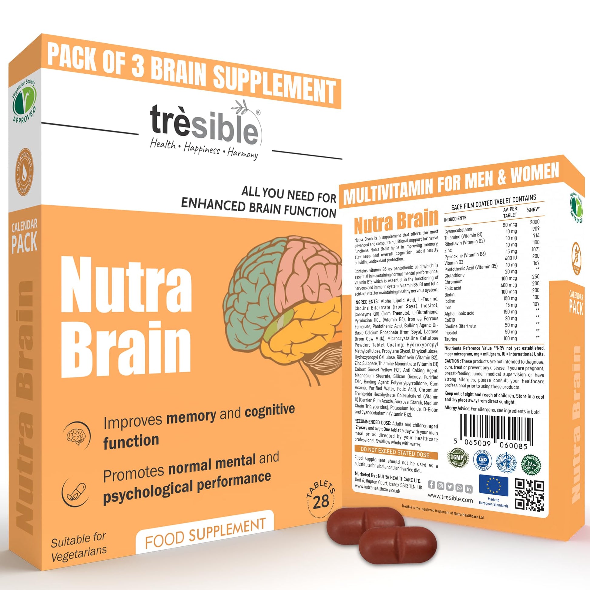 Unlock Your Full Potential with Trèsible Nutra Brain! Unlock your full potential with our advanced Brain Supplement, specially formulated to provide the best multivitamins for cognitive support. Ideal for men and women over 50, this supplement helps enhance mental clarity, focus, and memory, ensuring you stay sharp and vibrant throughout your daily activities. Packed with essential brain vitamins, including Zinc, Iron, and Iodine, Trèsible Nutra Brain is designed to support not just cognitive function but also overall well-being. Whether you’re in your 60s or still in your 50s, this multivitamin offers key nutrients to maintain brain health, while also promoting immune system strength and joint support. Why Choose Trèsible Nutra Brain? Our formula offers more than just cognitive support. It's a complete wellness solution for adults seeking to maintain an active lifestyle. Zinc plays a crucial role in immune function and metabolism, while Iron helps boost energy and circulation. Iodine supports thyroid health, ensuring proper energy management and overall well-being. Support for an Active Lifestyle Designed for both men and women, Trèsible Nutra Brain delivers a convenient 4-week supply of vegetarian-friendly tablets. Whether you’re retired, working, or juggling family commitments, this supplement helps you stay mentally and physically strong, so you can focus on what matters most. Invest in Your Well-Being Trèsible Nutra Brain is the perfect multivitamin for men and women looking to support brain health, immune function, and joint health. Stay sharp, energised, and active with a supplement that works as hard as you do.More Info