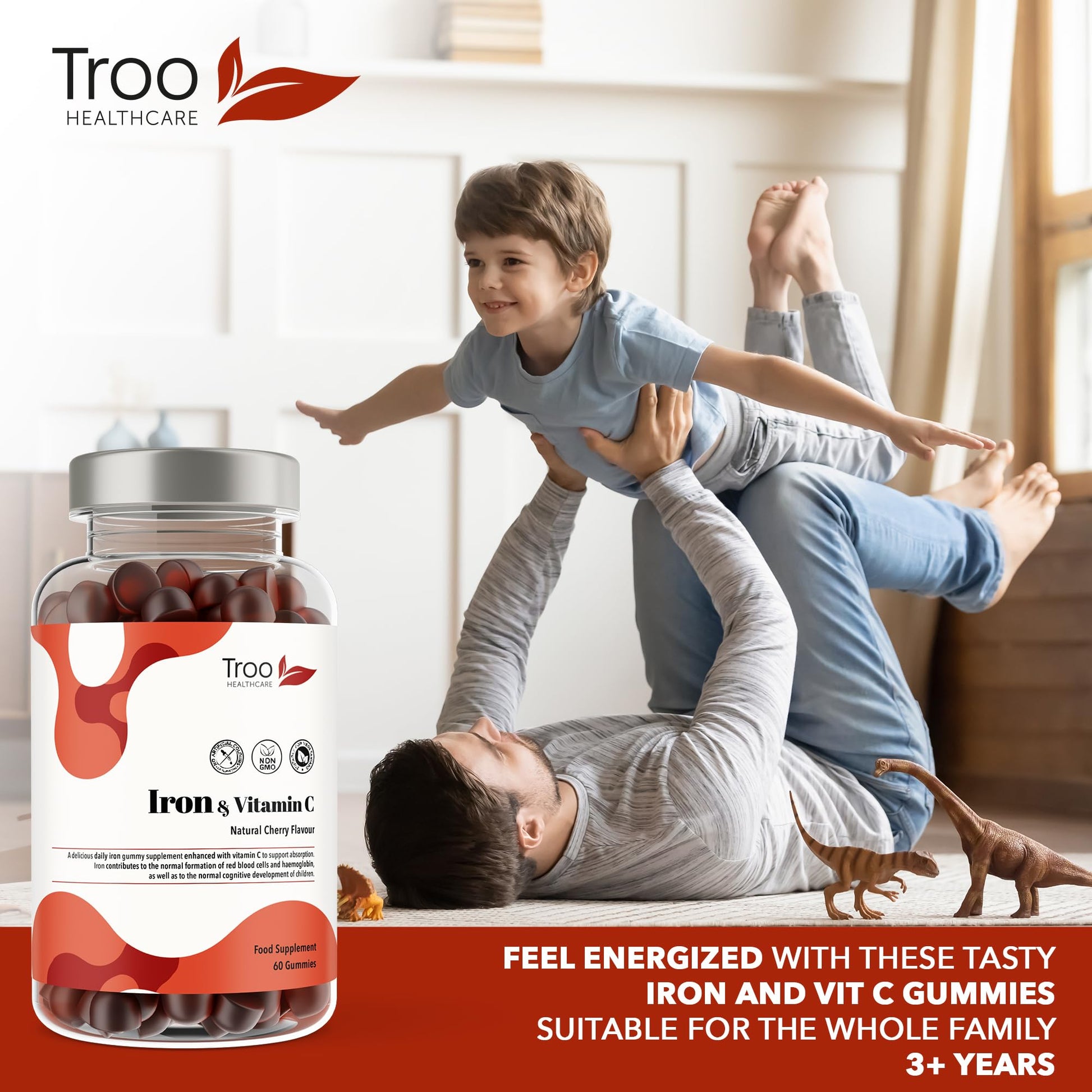 Troo Health Care Iron & Vitamin C - 60 Natural Cherry Flavour Gummies - Tasty Chewable Supplement for Men, Women and Kids - Increased Absorption Supports Cognitive Development & Red Blood Cell Formation