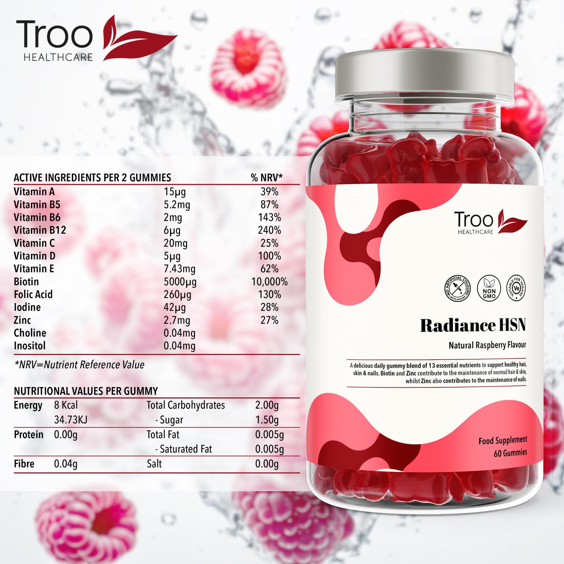 Troo Health Care Radiance HSN 60 Raspberry Flavour Gummies - Advanced Hair Skin & Nails Supplement for Men & Women - 13 Essential Nutrients Inlcuding Biotin