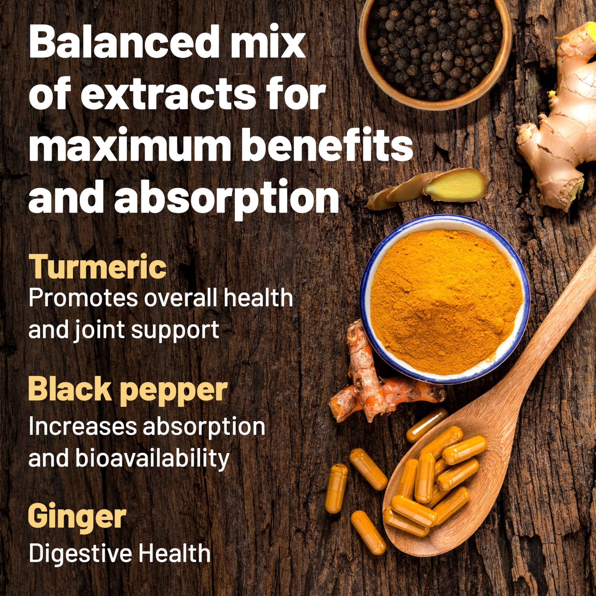 Turmeric and Black Pepper Capsules High Strength with Ginger Supplement 2500mg Equivalent - Curcumin Capsules 92%, Piperine 95%, Gingerols 5% - 60 Capsules - 2 Months Supply, 100% Vegan, GMP