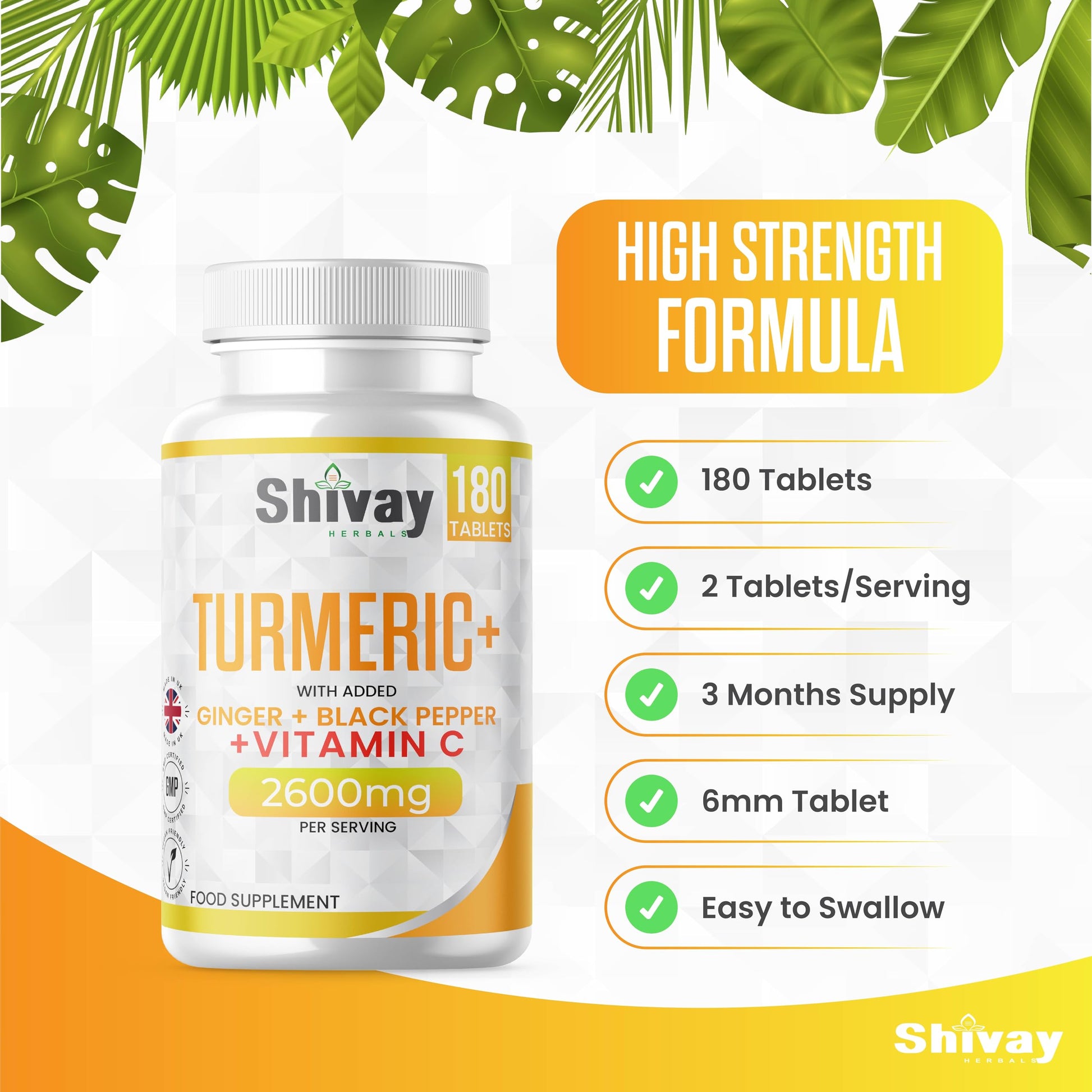 Turmeric 2600mg Per Serving | 180 Vegan Tablets - 3 Month Supply | with added Ginger, Black Pepper & Vitamin C | High Strength Curcumin Supplement | Made in the UK | Shivay HerbalsMore Info
