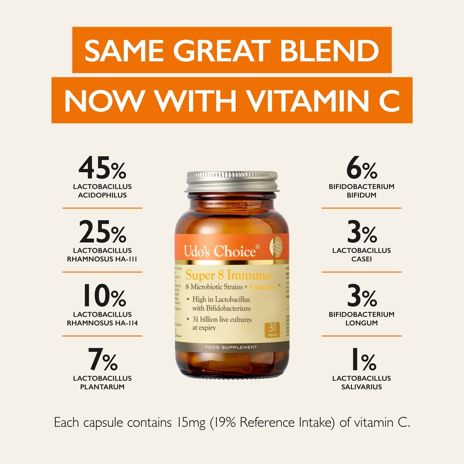 - NEW IMPROVED FORMULA - Super 8 Immune contains the same great blend of microbiotics as in international award winning Super 8 but now with vitamin C for immune support.