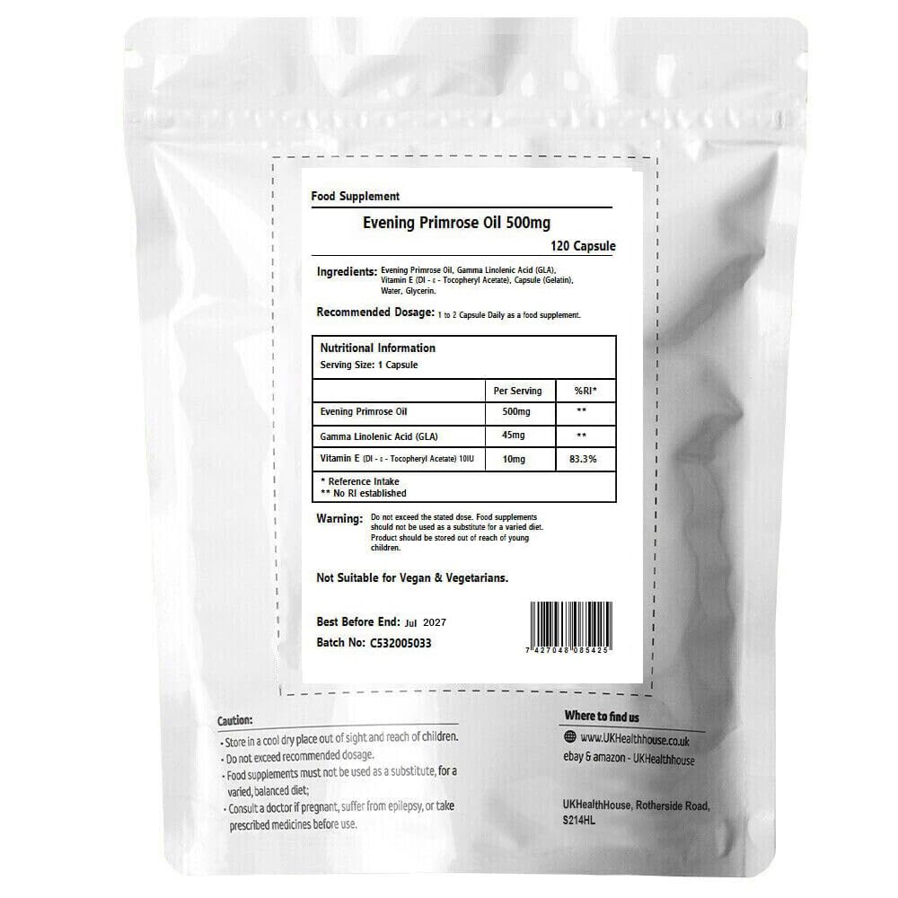 UKHealthHouse Evening Primrose Oil Capsules - 500mg - High Strength - 45mg GLA (120) - Great for Skin, Immune System, Hormonal Pain & Women’s Health