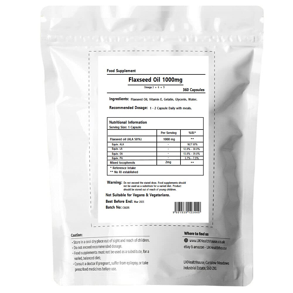 UKHealthHouse Flaxseed Oil Capsules 1000mg x 360 Softgels High Strength Cold Pressed High in Omega 3, 6, 9 Linseed Oil ALA Linoleic Oleic Acid Essential Fatty Acids