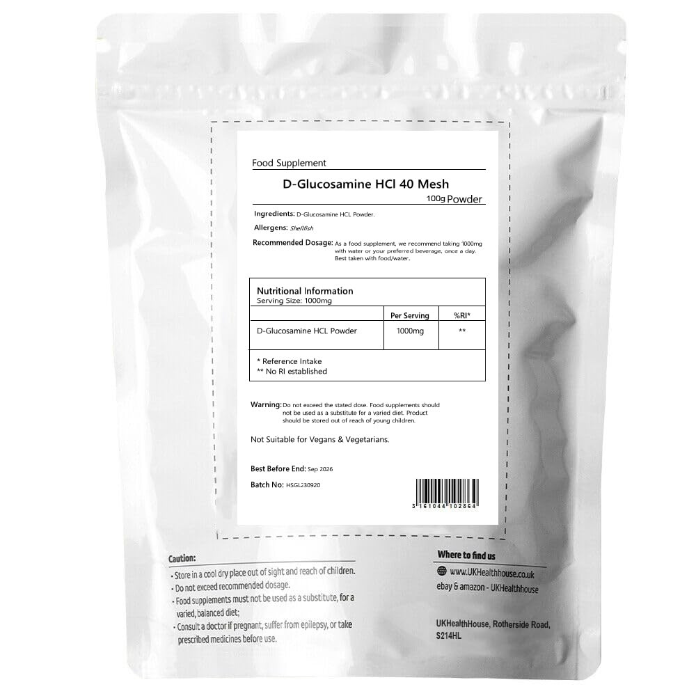UKHealthHouse Glucosamine Hydrochloride Powder Joint and Cartillage Support Extra Strength 40 Mesh D-Glucosamine HCL Powder Glucosamine HCL Supplement (100g)