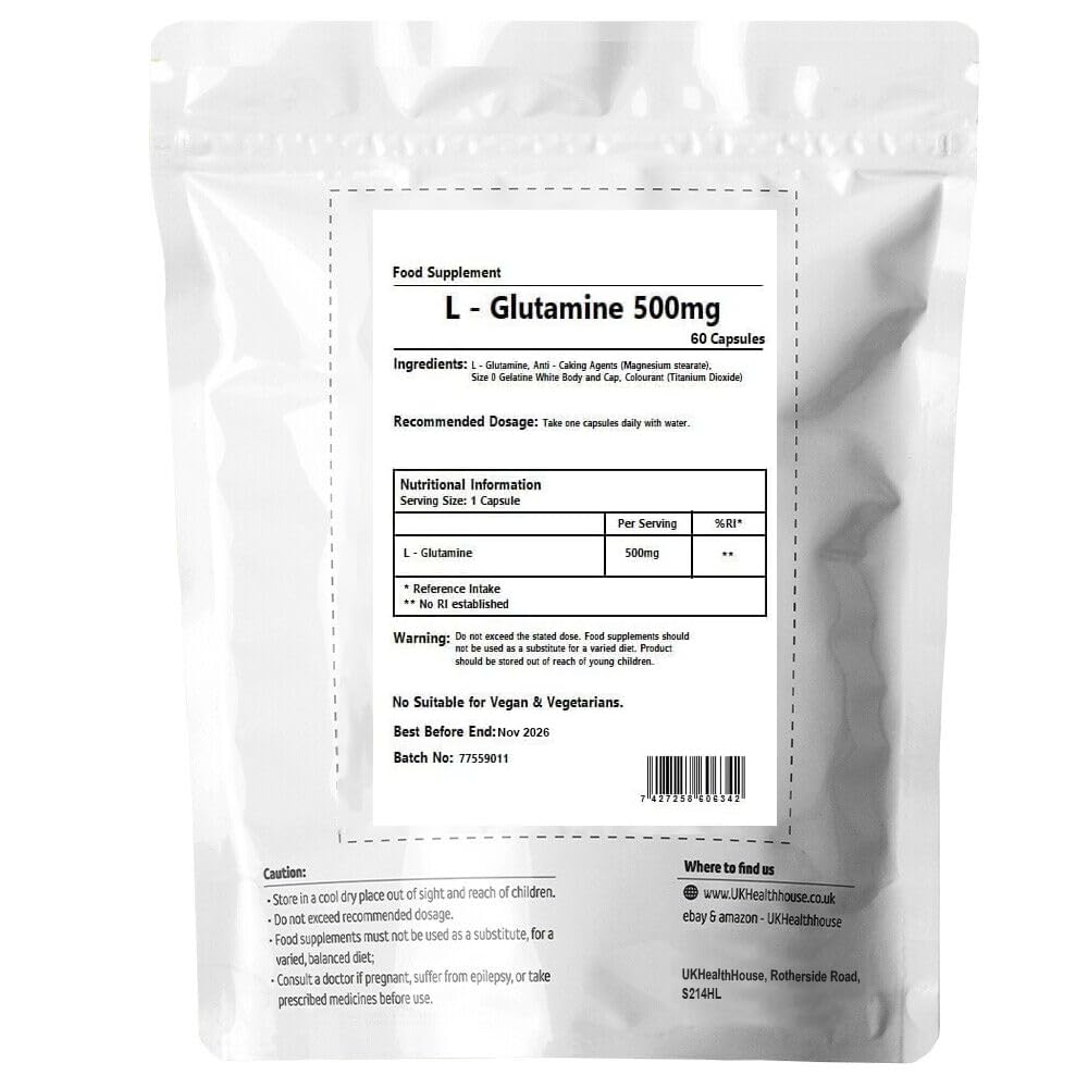 UKHealthHouse L-Glutamine Amino Acids 500mg x 60 Capsules Rapid Release Support Muscle Recovery Supplements High Strength Targeted Release Supplement