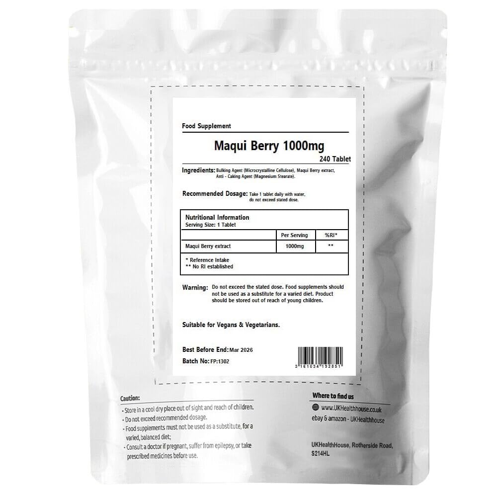 Ingredients: Bulking Agent (Microcrystalline Cellulose), Maqui Berry extract, Anti-Caking Agent (Magnesium Stearate).