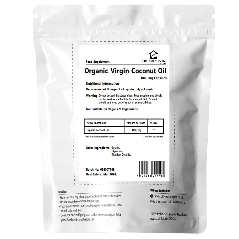Food Supplement Coconut Oil 1000mg Capsules Ingredients: Virgin Coconut oil, Capsule Shell (Gelatin, Glycerin, Purified Water). Recommended Dosage: Take one to four capsules daily. Take one hour before bedtime as a food supplement or as directed by a healthcare professional. Allergens: None. Free From: Dairy Free, Gluten Free, Soya Free, Yeast Free, Peanuts Free, Nut Free, Sesame Seeds Free, Egg Free, Fish Free. Nutritional Information: Serving Size: 1 Capsule. Each Serving Providing: Coconut Oil 1000mg(Per Serving) **(%NRV*) *Nutrient Reference Value. **No NRV established Warning: Do not exceed the recommended stated daily dose. Food supplements should not be used as a substitute for a balanced, varied diet and a healthy lifestyle. Not suitable for children. If you are pregnant, breastfeeding or taking any medication, consult a doctor before use. Store in a cool, dry place. Keep out of the reach of young children. Not Suitable for Vegans & Vegetarians. Best Before End: Apr 2027. oil coconut organic hair body virgin massage ヘアオイル cooking baby cold extra skin pressed growthMore Info