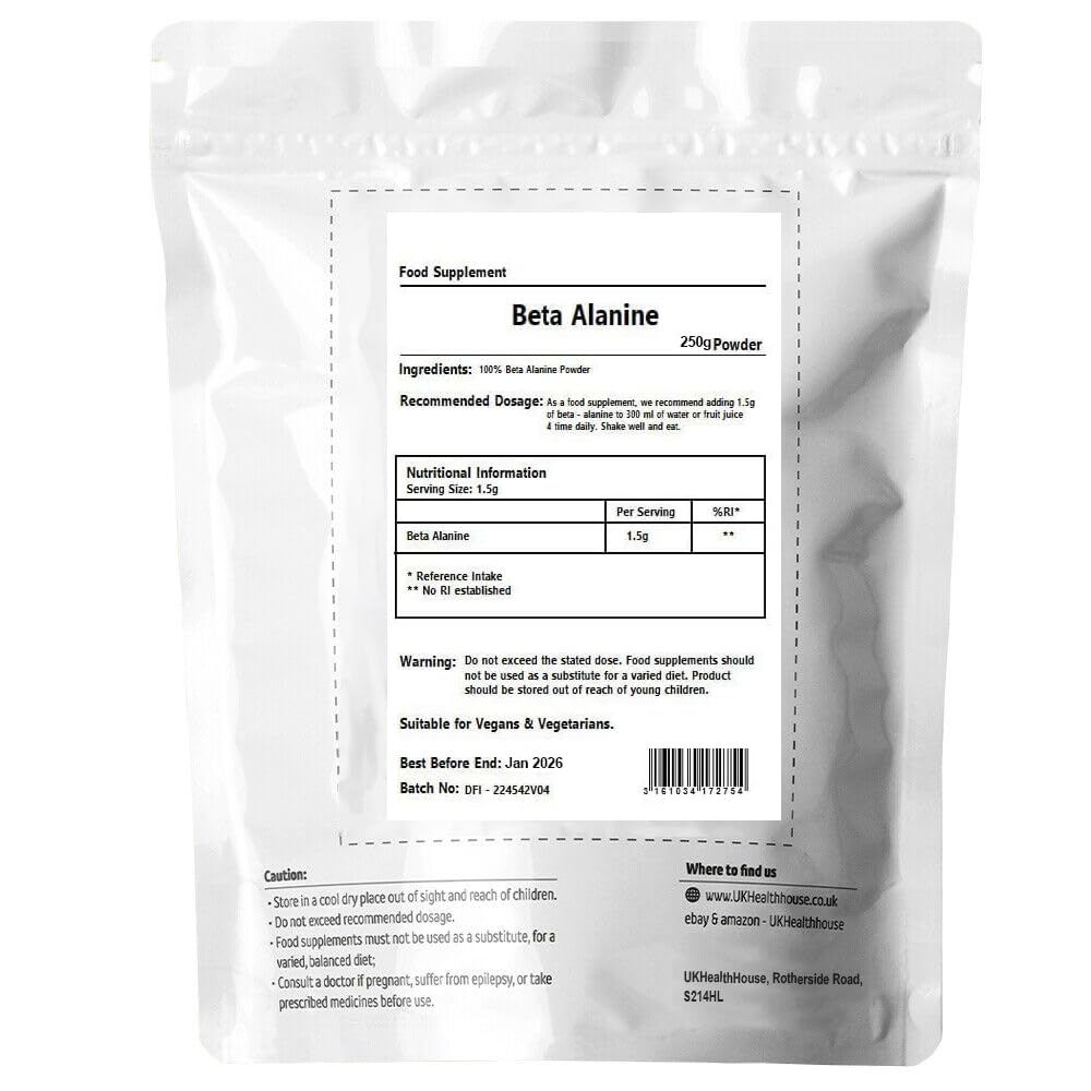 Recommended Dosage: As a food supplement, we recommend adding 1.5g of beta-alanine to 300 ml of water or fruit juice 4 time daily. Shake well and eat.