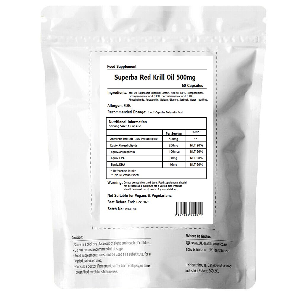 Ingredients: Krill Oil (Euphausia Superba) Extract, Krill Oil (20% Phospholipids), Eicosapentaenoic acid (EPA),p Docosahexaenoic acid (DHA), Phospholipids, Astaxanthin, Gelatin, Glycero, Sorbitol, Water-purified.