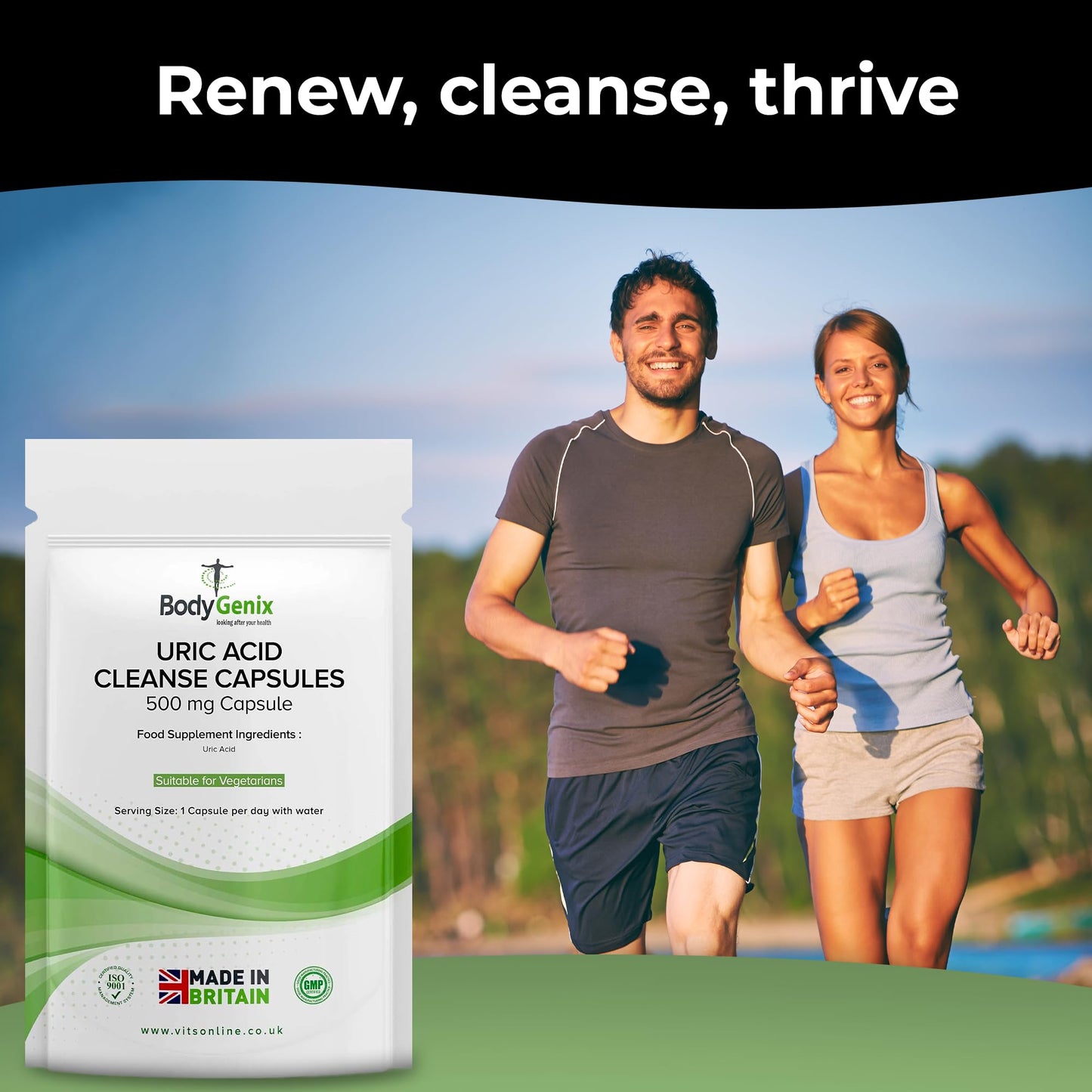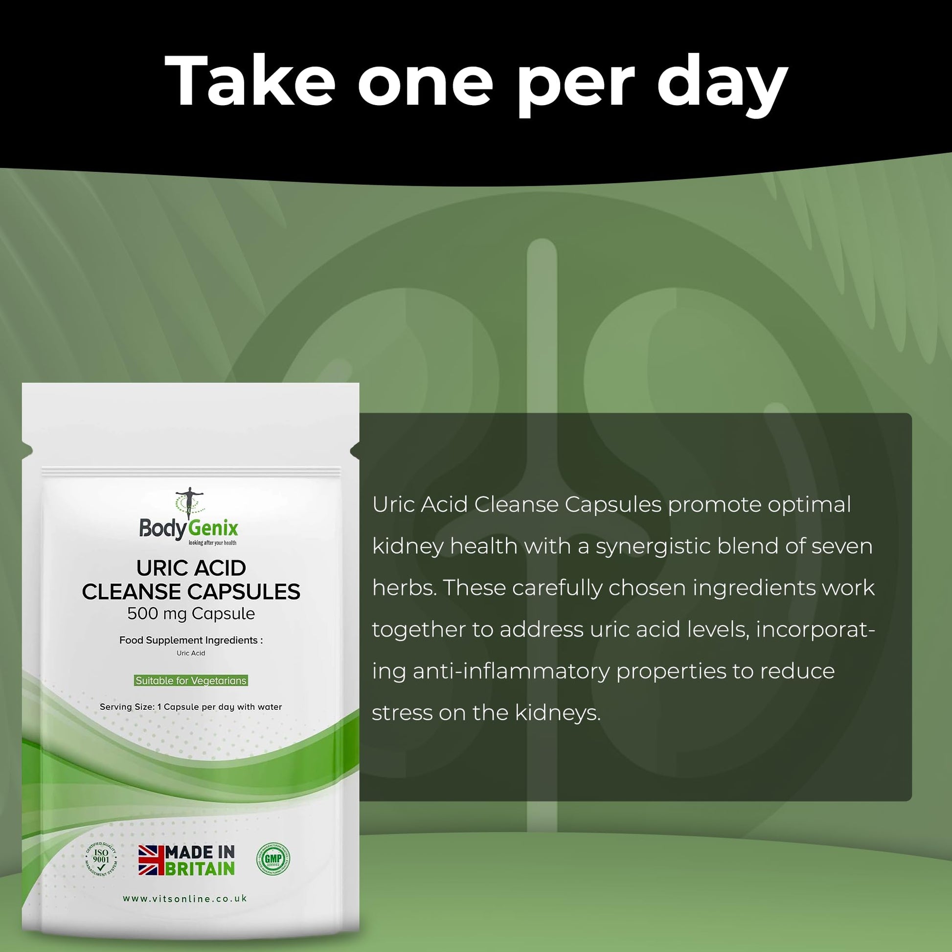 Bodygenix looking after your health Uric Acid Cleanse Capsules Available in pack of: 30, 60 and 120 As a normal byproduct of purine metabolism, uric acid is something your body has to deal with every day. The burden falls mainly on the liver and kidneys, because they are the organs primarily responsible for filtering and purifying the blood and eliminating metabolic byproducts. Bodytronix Uric Acid Cleanse features a synergistic combination of seven time-tested herbs formulated to support healthy liver and kidney function. This Bodygenix Uric Acid Cleanse capsule made with all natural ingredients like Agaricus bisporus 200 mg, Turmeric (root) 150 mg, Yucca Root 4:1 Extract, 50 mg, Artichoke Leaf 4:1 Extract (Cynara scolymus 12.5 mg, Tart Cherry Powder.