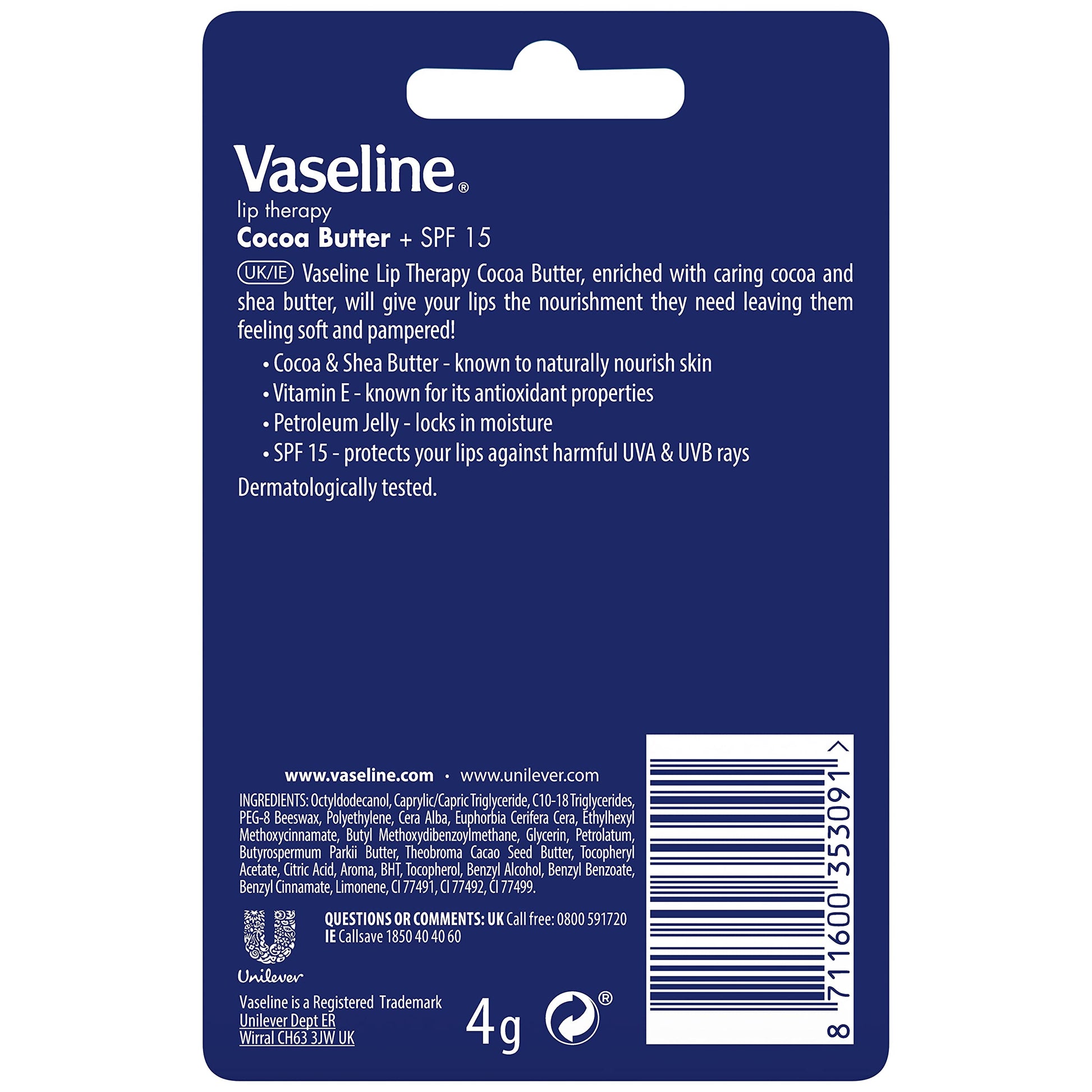 - This lip moisturizer contains triple-purified Vaseline Petroleum Jelly, rich cocoa and shea butter, and Pro-Vitamin E (protects against free radicals)