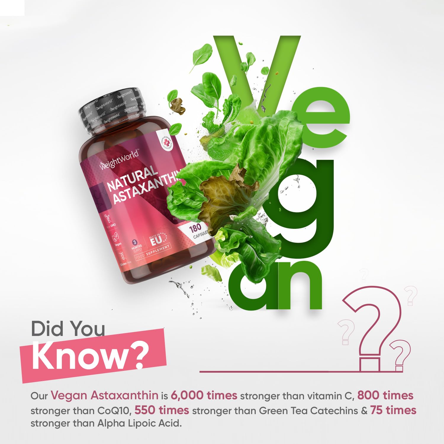 Vegan Astaxanthin High Strength - 180 Capsules - 8mg Active Astaxanthin from 160mg Hawaiian Haematococcus Pluvialis Algae - Pure & Natural Astaxanthin - Skin & Immunity Supplement - Allergen Free