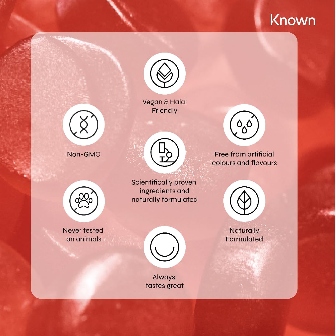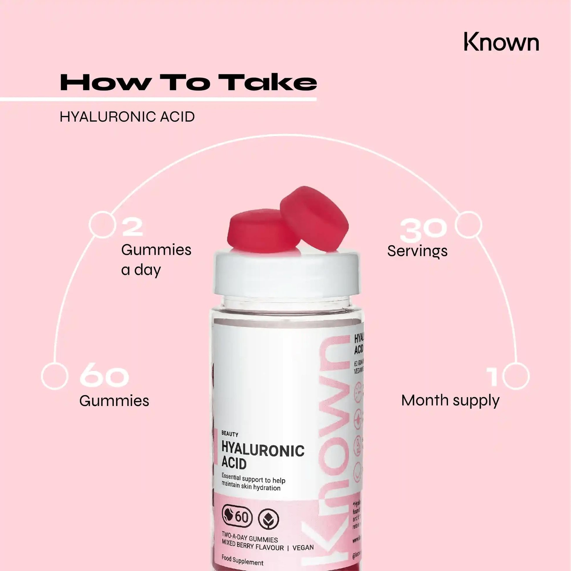 Introducing Vegan Hyaluronic Acid Gummies by Known Nutrition. Our delicious Hyaluronic Acid Gummies are a great source of the moisture-retaining molecule, in a convenient and tasty gummy format. Each serving offers you 100mg of Hyaluronic Acid, designed to help your skin feel and look hydrated, plump and healthy. Hyaluronic Acid occurs naturally in our connective tissues, like our joints, muscles, and skin, and it has the unique ability to store up to 1000 times its weight in water. But as we age, the amount of Hyaluronic Acid our cells produce begins to decrease, which can lead to fine lines, wrinkles and rough skin texture. So, if you want to maintain your youthful glow, incorporating Hyaluronic Acid gummies into your anti-ageing skincare routine is definitely a good idea. Known Hyaluronic Acid gummies have excellent absorption and bioavailability, they’re a perfect solution to include Hyaluronic Acid in your regular beautifying routine. Give your skin its glow back with our deliciously flavoured mixed berry gummies, free from artificial colours, flavours and preservatives. Our Hyaluronic Acid Gummies contain 60 gummies, offering one month’s supply.More Info