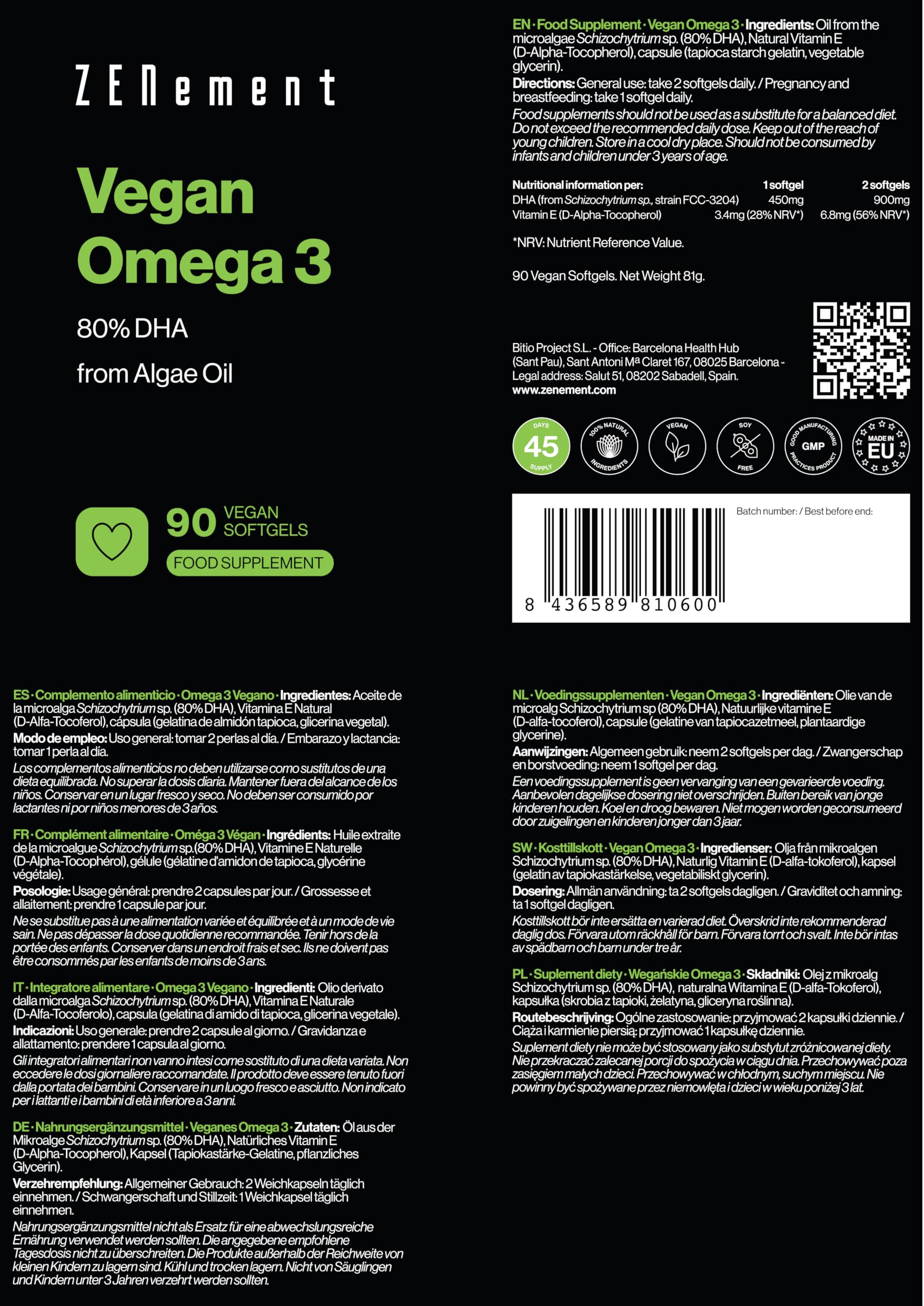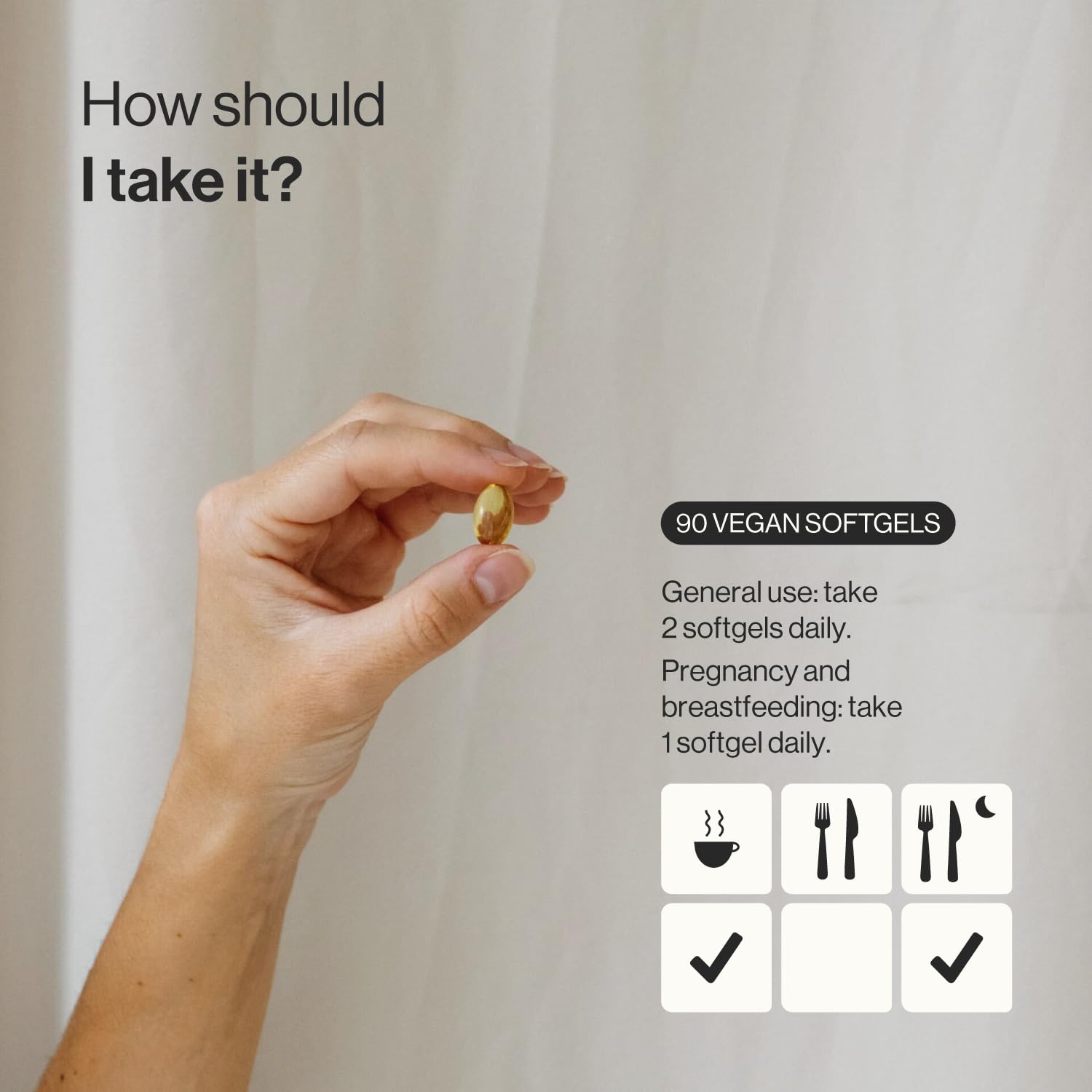 Content per dose: 1 softgel 2 softgels DHA (from Schizochytrium sp., strain FCC-3204) 450 mg 900 mg Vitamin E (D-alpha-Tocopherol) 3.4 mg (28% NRV*) 6.8 mg (56% NRV*) *NRV: Nutrient Reference Value. Discover the ultimate plant-based solution to your omega-3 needs with our Vegan Algae Oil Softgels. Specially formulated to provide a potent source of DHA, these softgels are perfect for vegans, vegetarians and anyone looking for a sustainable alternative to fish oil that offers the same benefits. Why choose our Omega-3 Softgels? High absorption and potency: Each softgel is packed with high-quality algae-derived DHA. This ensures that you get omega-3 with 80% DHA for optimal well-being. Our product provides a total of 450mg of DHA per softgel. Natural and additive-free: Our formula is additive-free and tested for heavy metals, providing a clean and safe supplement option. We prioritise your well-being by eliminating unnecessary ingredients. In addition, our product contains natural vitamin E to protect against oxidation and enhance overall benefits. High absorption and bioavailability: Our softgels are easy to swallow and designed for maximum absorption. Enjoy the benefits of plant-based omega-3 as they help maintain normal brain and sight function. In addition, maternal intake of DHA contributes to normal brain and eye development in the foetus and breastfeeding infant, as well as normal visual development in infants up to 12 months of age. Certified quality: We are committed to providing you with the highest quality supplements. Our product is certified vegan, additive-free, heavy metal-free, non-GMO, allergen and GMP certified. Choose our Vegan Omega 3 Algae Oil Softgels for a high-quality formula that can meet your body's DHA needs. Each jar contains 90 softgels, providing over a month's supply if you take the recommended two capsules daily. Experience the difference of a clean, plant-based supplement designed with your well-being in mind.More Info