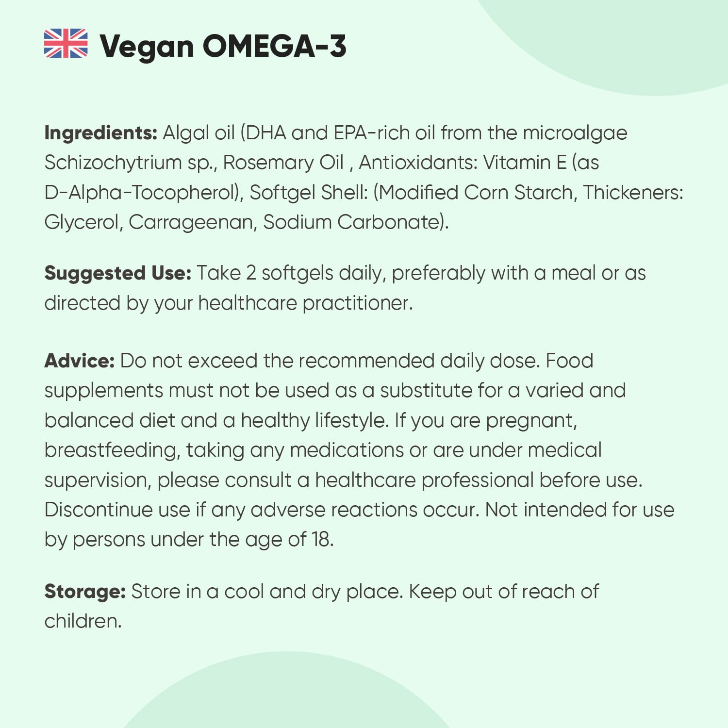Our Vegan Omega 3 Softgels are 100% plant-based and derived from sustainably sourced Schizochytrium marine microalgae, ensuring no impact on marine ecosystems or fish populations. Unlike traditional fish-based Omega 3, these softgels are entirely vegan-friendly and provide a potent dose of 600mg DHA and 300mg EPA per daily serving (2 softgels). Our Vegan Omega 3 softgels contain 600mg DHA and 300mg EPA per daily serving. EPA and DHA contribute to the normal function of the heart, maintenance of normal blood pressure and blood triglyceride levels (EFSA Approved Claims). Carefully formulated for quality and safety, these softgels are solvent-free, GMO-free, and free from common allergens like gluten, lactose, and wheat. They are also free from binders, fillers, excipients, and harmful environmental contaminants. Designed for both men and women, this high-strength supplement comes with a 45-day supply in each bottle, ensuring a convenient and sustainable way to meet your Omega 3 needs.More Info