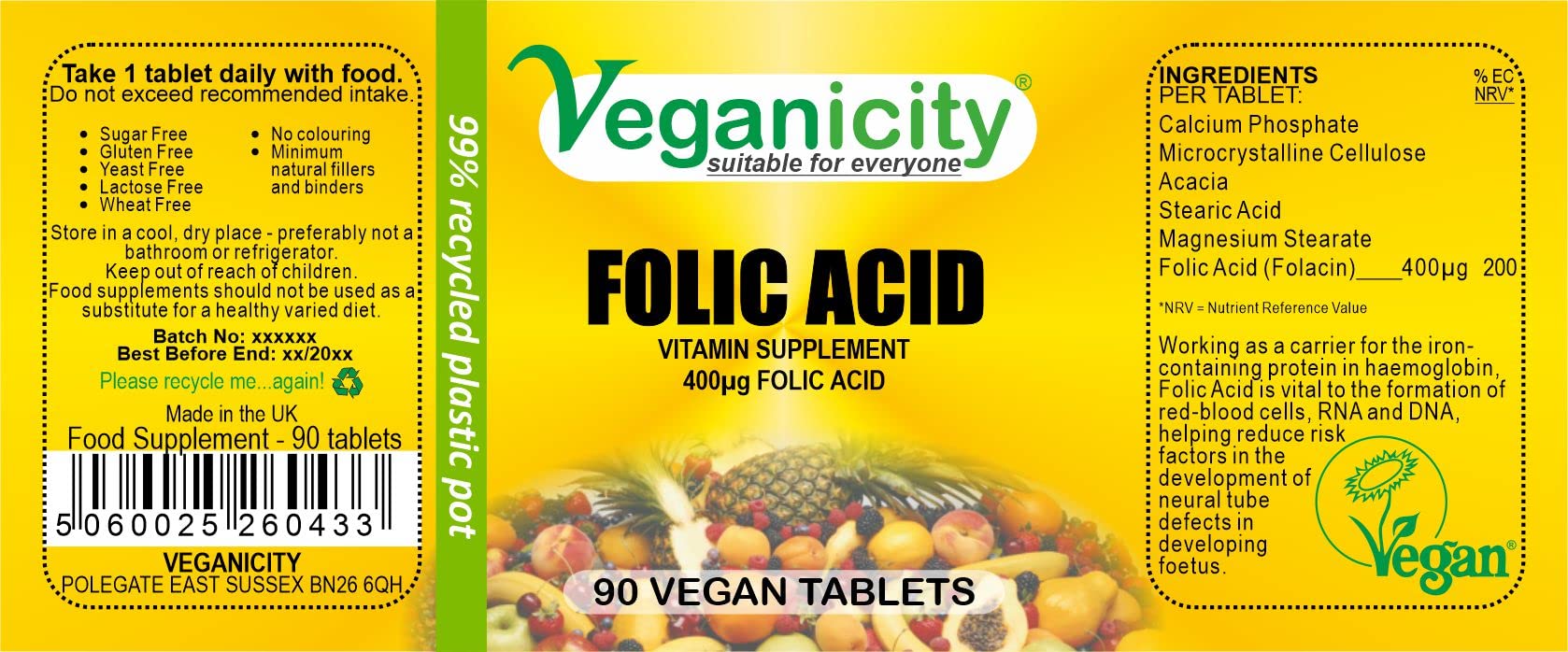 Veganicity Folic Acid 400µg : B Vitamin Supplement - 90 Tablets, in a Planet-Friendly 99% Recycled Pot