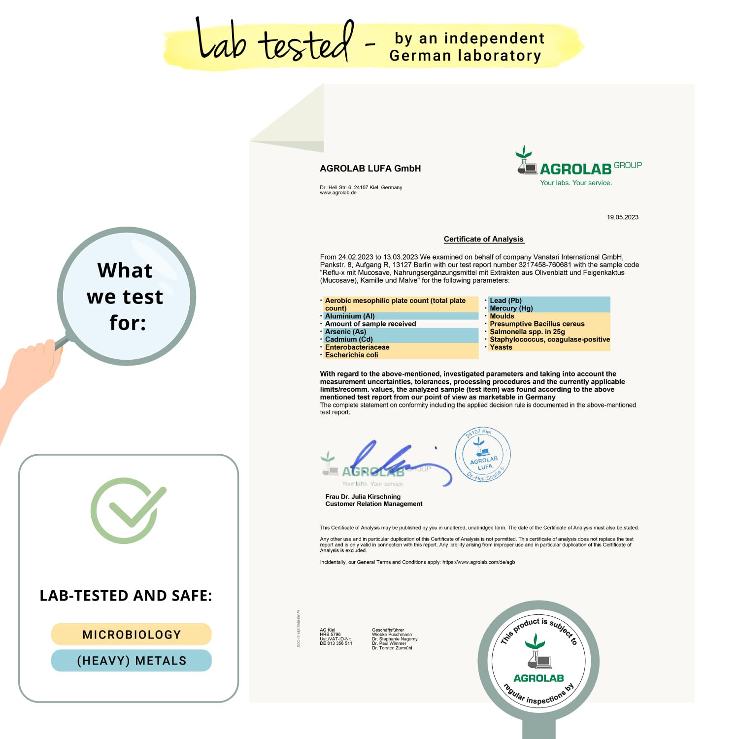 • ⭐ HIGH-QUALITY INGREDIENTS: Our Reflu-X Complex is a unique mix of high quality materials. We added Mucosave®, a branded and clinically tested raw material from BIONAP in Italy that contains a polysaccharide-rich prickly pear cactus extract and an extract from olive leaves that is full of biophenols. We combined this herbal blend with sodium alginate, which is extracted from brown algae, as well as flower extracts from mallow and chamomile for a well-rounded, natural supplement.