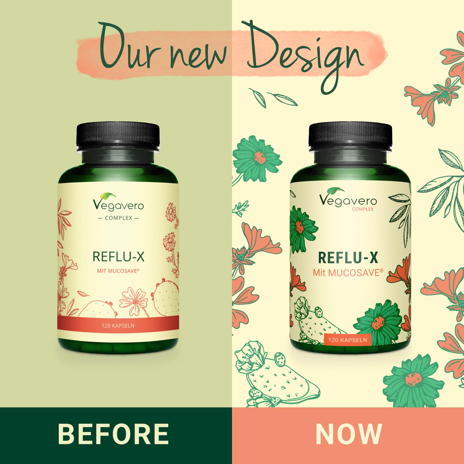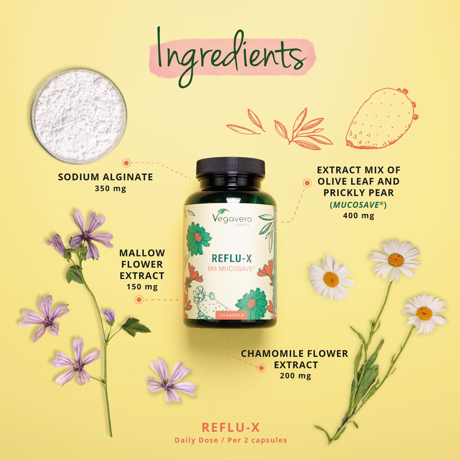 Vegavero Reflu-X Complex | Natural Antacid | Stomach Capsules for Reflux and Gastritis | with Mucosave®, Olive Leaf Extract, Sodium Alginate, Chamomile | NO Additives | 120 Capsules | Vegan
