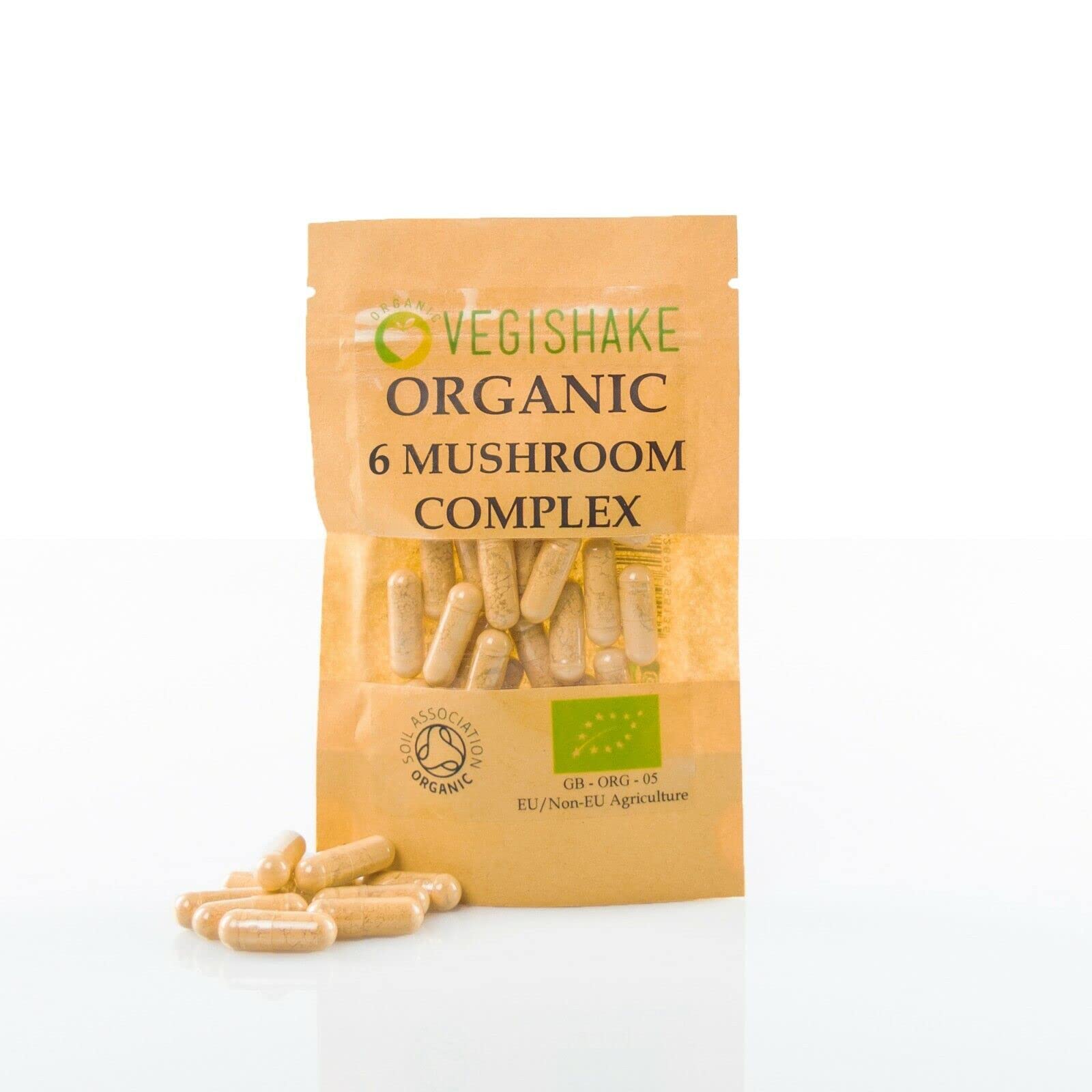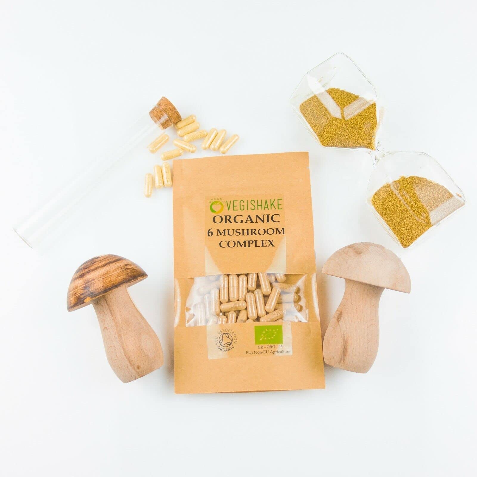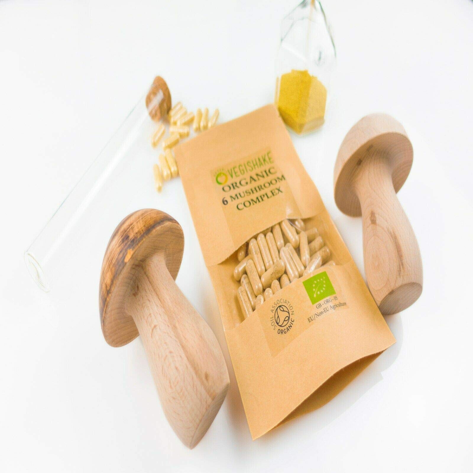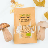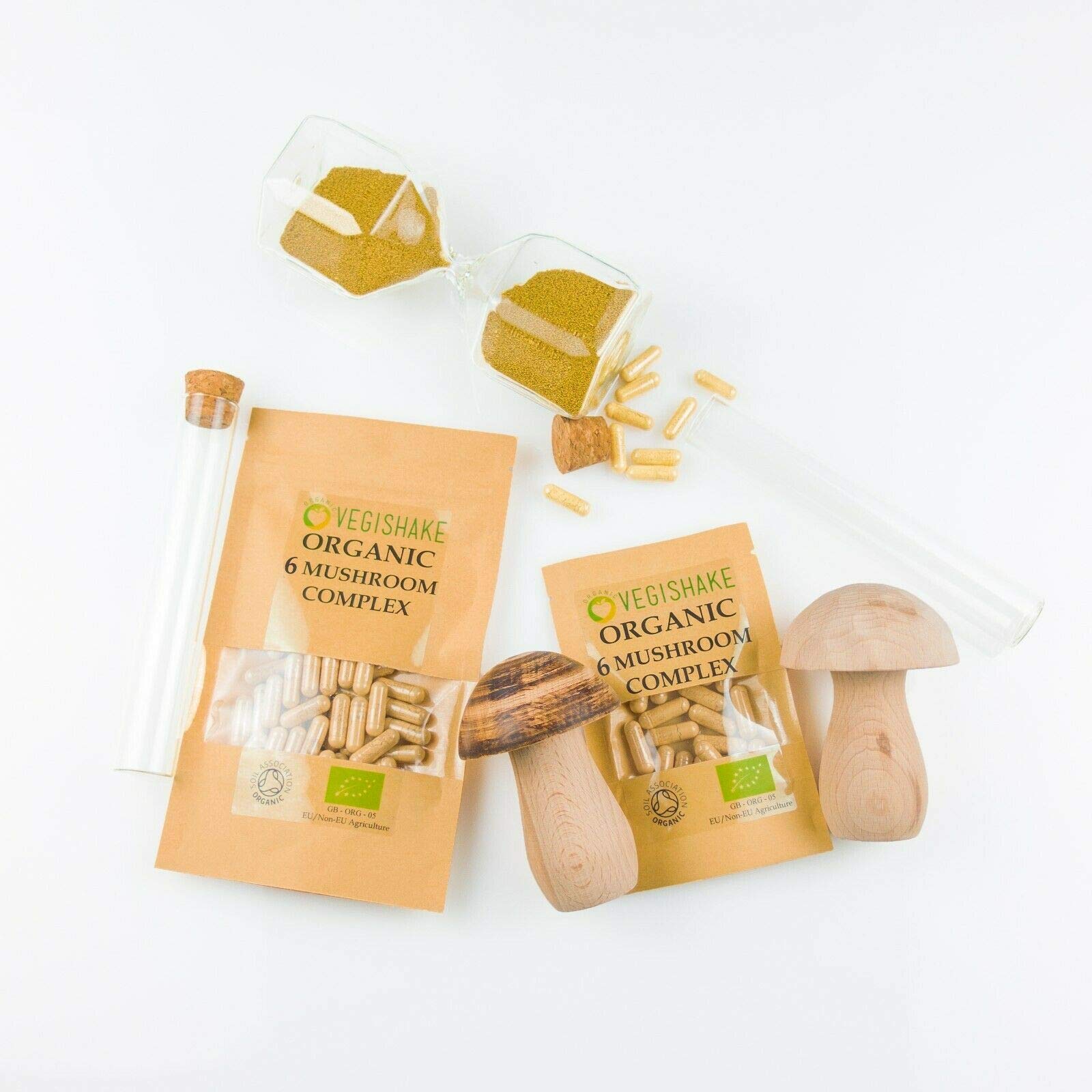 Organic 6 Mushroom Complex Extracts Capsules (Vegan Halal Kosher)Combining all the benefits from a whole range of organic mushroom powders, known for their potential immune system - anti properties. These dense nutrients of organic mushrooms is a powerful mix.