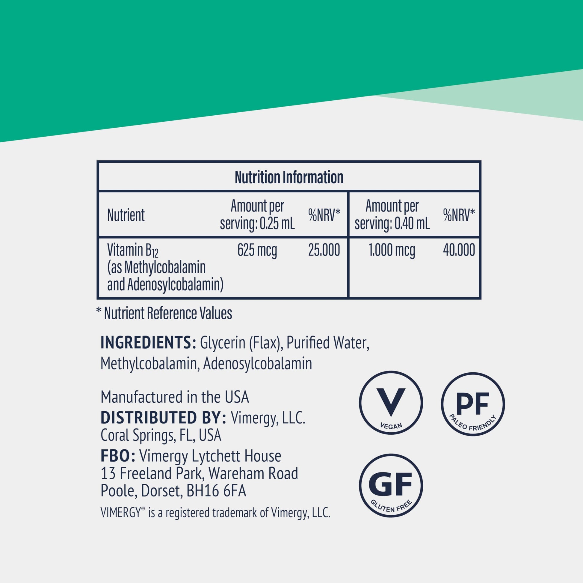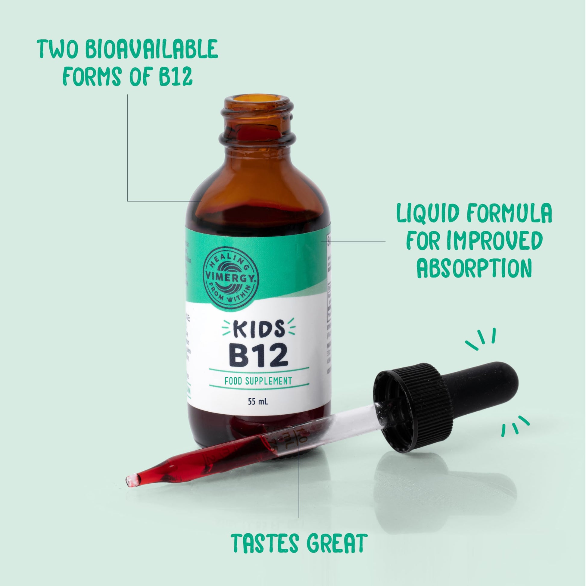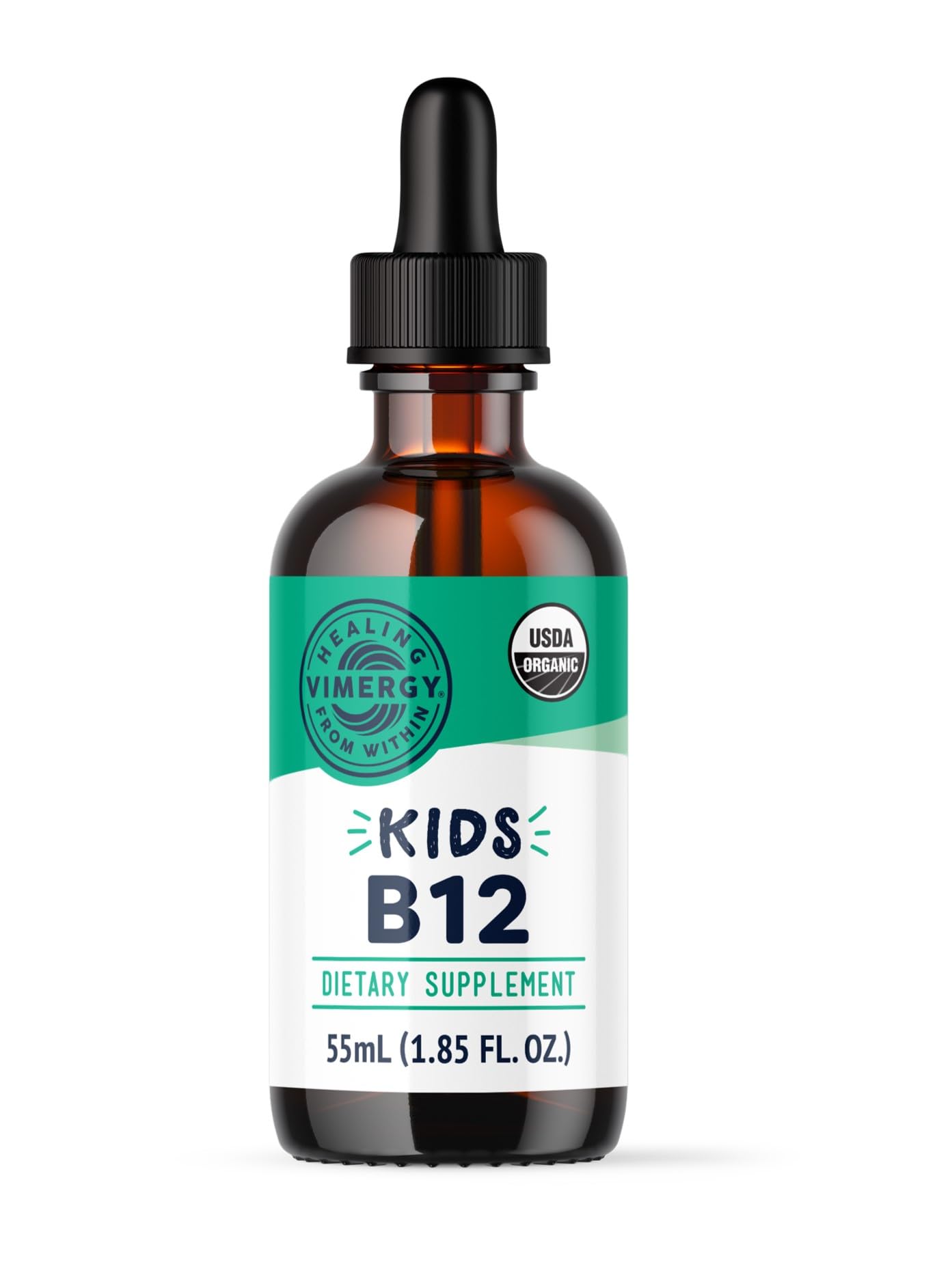 Vimergy Kids B12 is an easy-to-take liquid vitamin powered by 2 bioactive forms of B12 that act as vital components of many processes along the developmental timeline (when nutrients are needed the most). Vitamin B12 is an essential component in hundreds of body processes including healthy nervous system function, energy metabolism, and red blood cell production. Vimergy Kids B12 helps ensure your children are covered! Vimergy Kids Vitamin B12 brings: A marked dropper! Get an easy–to-measure dose of high-quality Vitamin B12 based on YOUR child’s age. A targeted blend of methylcobalalmin and adenosylcobalamin - two very bioavailable and important forms of B12. Non-GMO, Gluten-Free, Kosher, Vegan & Paleo Friendly No Citric Acid, Alcohol, Sugar, Colors or Flavors Triple third party verified to provide the goodness kids need, not nasties they don’t Vimergy Kids B12 contains two metabolically active, coenzyme forms of vitamin B12. This means they are the forms of vitamin B12 that are most easily recognized and used by the body. The two are like MVP teammates, working together to cover the many vitamin B12 related processes in the body. Supports 7 Essential Health Benefits for Your Child’s Growth and Development: Essential for normal functioning of the brain and nervous system. Helps reduce tiredness and fatigue. Aids in healthy red blood cell production. Vital for healthy immune system function. Important for producing healthy energy from food. Necessary for healthy psychological function. Plays a role in healthy cell division. The entire line of Vimergy liquid supplements is formulated to be faster absorbing than capsule or tablet forms. Formulated without binders, colors, or added sugar, these potent liquids make supporting your child’s health needs from day to day easy.More Info
