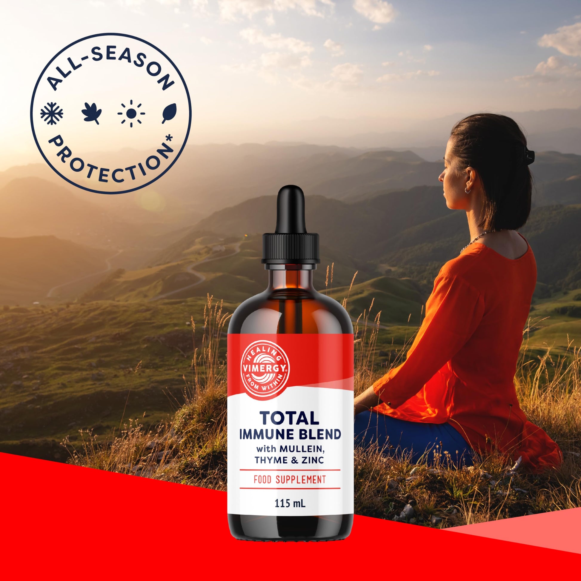 Vimergy Total Immune Blend is a delicious immunity supplement containing a potent triple combination of supportive ingredients. Powerful nutrients including clinically researched liquid zinc plus time-tested herbs, thyme & mullein, combine to deliver potent antioxidant support & help defend delicate tissues.
