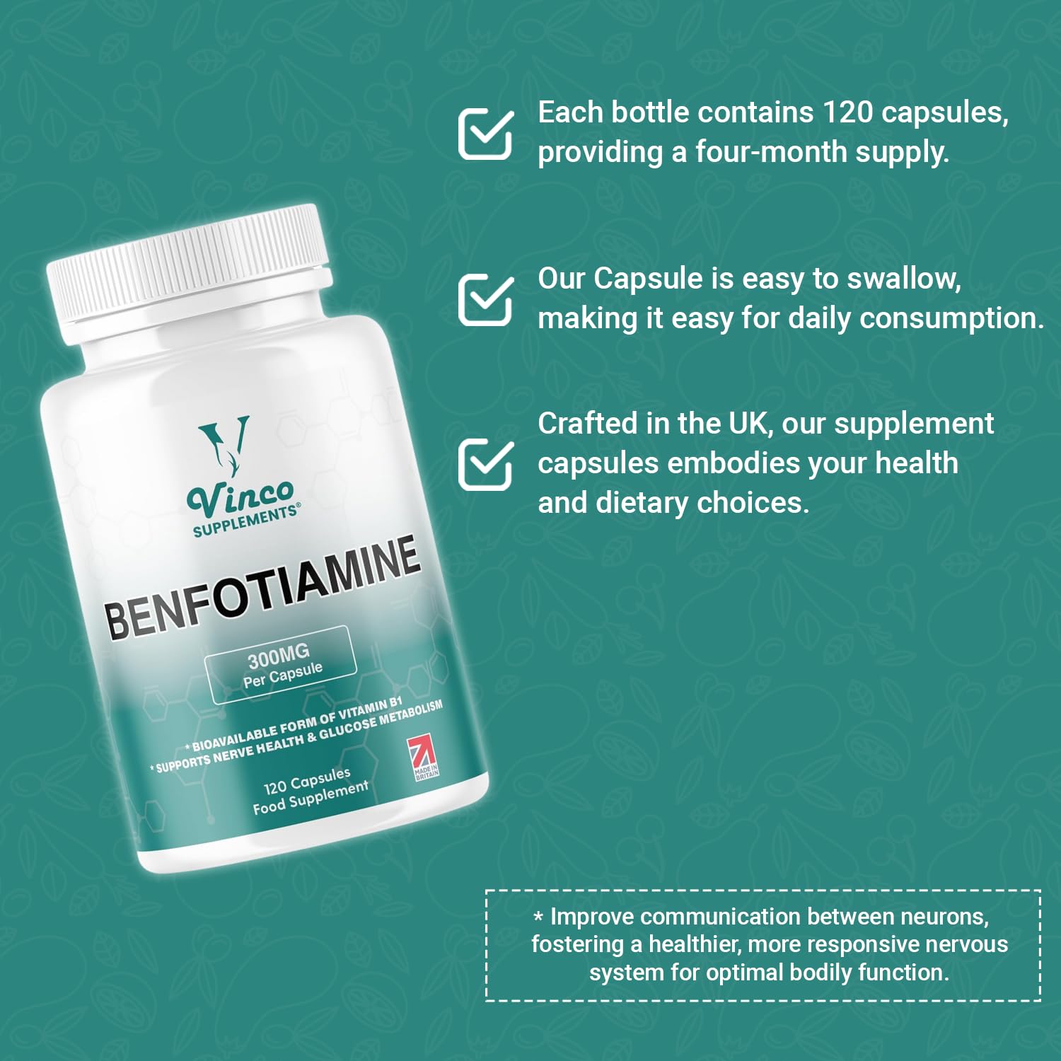 - BIOAVAILABLE VITAMIN B1: Discover the enhanced way to support your nerve health and glucose metabolism with our thiamine vitamin b1 supplement, a high-absorption derivative of Vitamin B1. This Benfotiamine 300mg your daily dose of energy metabolism aid, helping your body efficiently process sugars and fuel your activities without missing a beat.