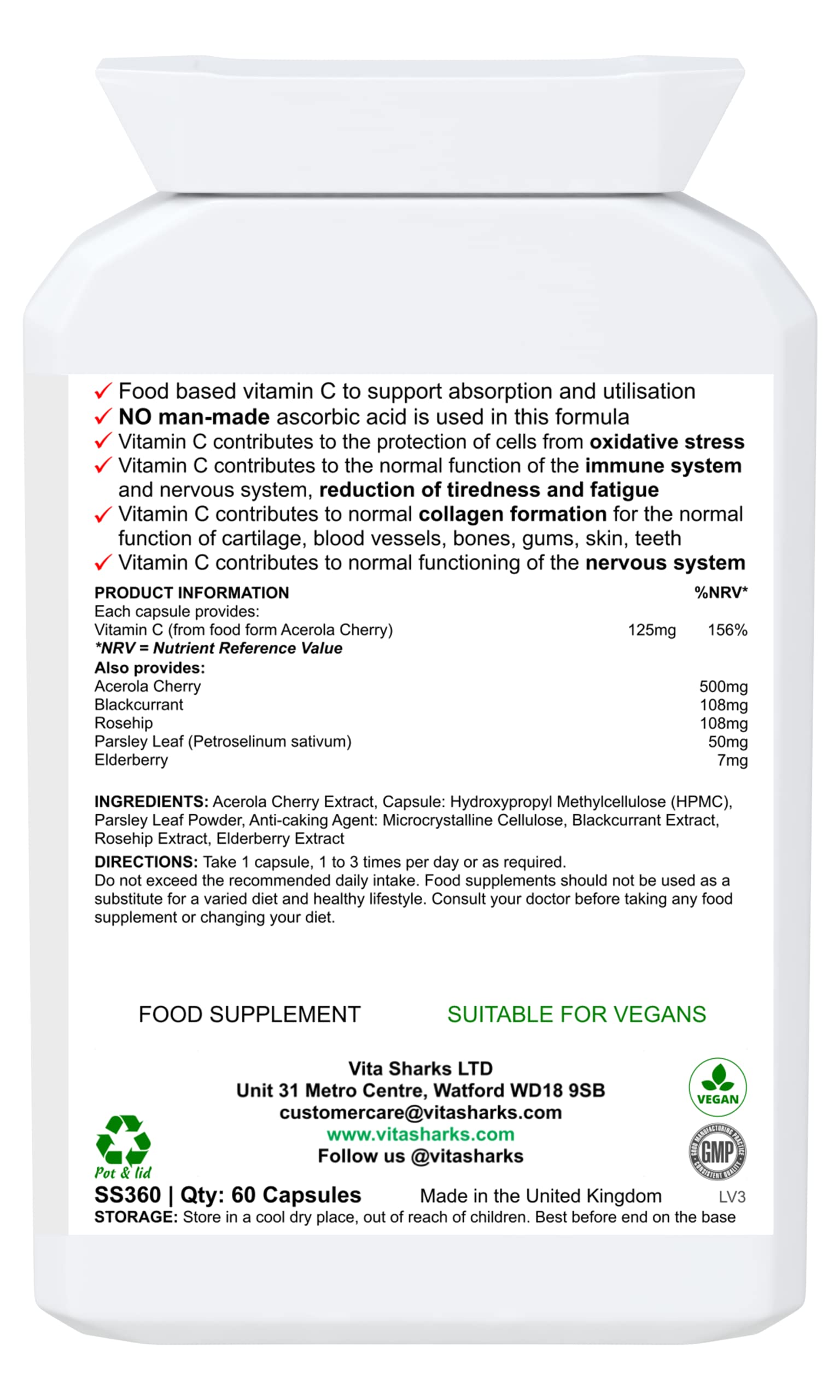 A gentle, non-acidic food form vitamin C supplement derived from fruits and herbs, namely: Acerola cherries, rosehips, blackcurrants, parsley leaf and elderberries. Vitamin C from Mother Nature. These food form ingredients are more readily absorbed and utilised by the body than synthetic vitamin C (ascorbic acid).More Info