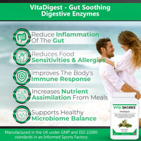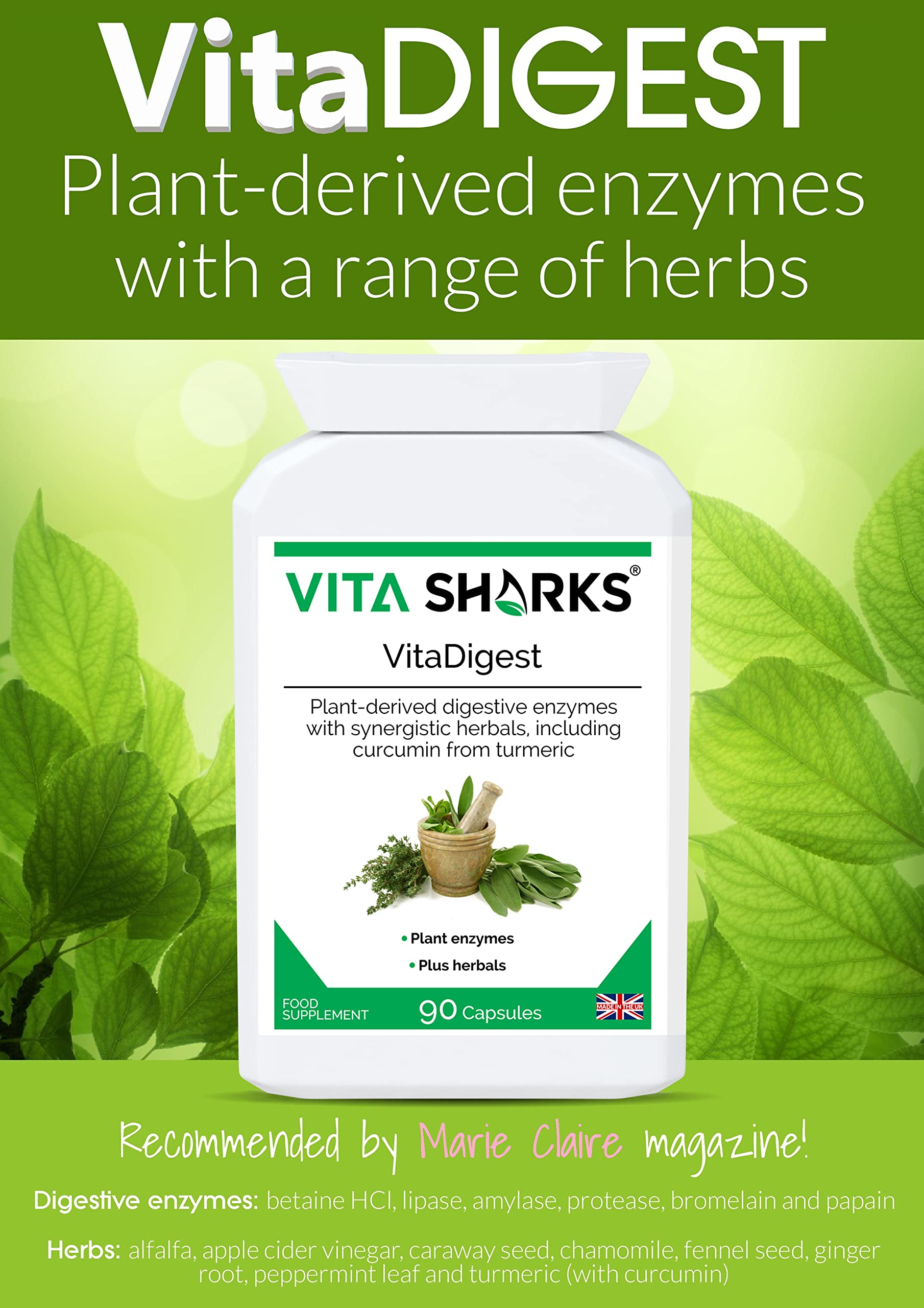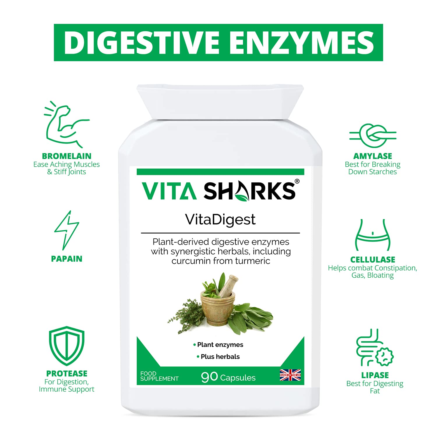 Vita Sharks VitaDigest Vegan 90 Capsules. Natural Gut Soothing Digestive Enzymes, Curcumin & Turmeric; for Gut Cleansing, Immunity & to Combat Bloating, Bowel & Digestion Issues