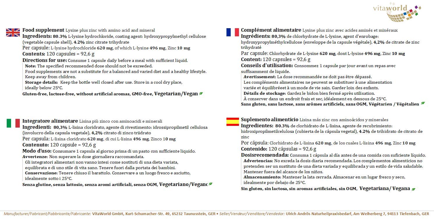 Vita World L-Lysine 600mg + Zinc 120 Vegetarian Capsules Made in Germany