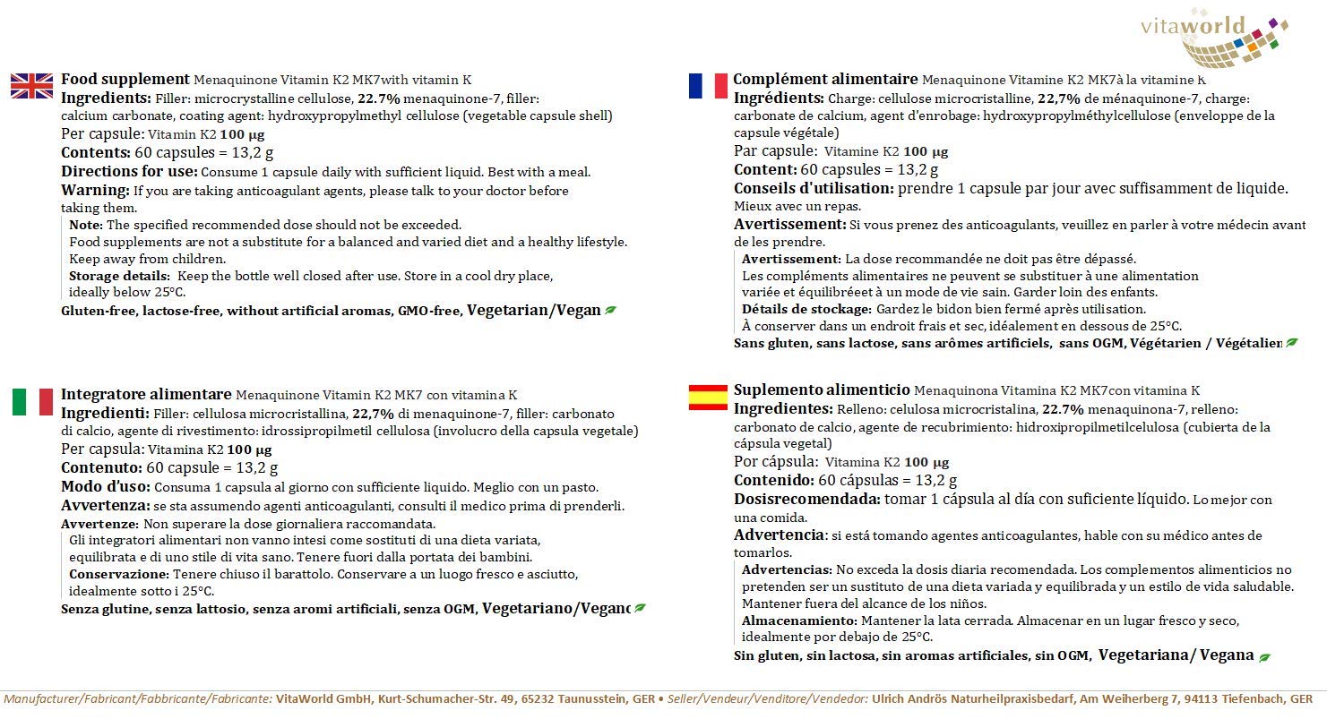 Contents: 60 Capsules= 13,2g Ingredients: Filler: microcrystalline cellulose, menachinone-7, filler: calcium carbonate, coating agent: hydroxypropylmethylcellulose (vegetable capsule shell). Suggested use: Consume daily 1 capsule with sufficient liquid. Expiry date: at least 1 yearMore Info